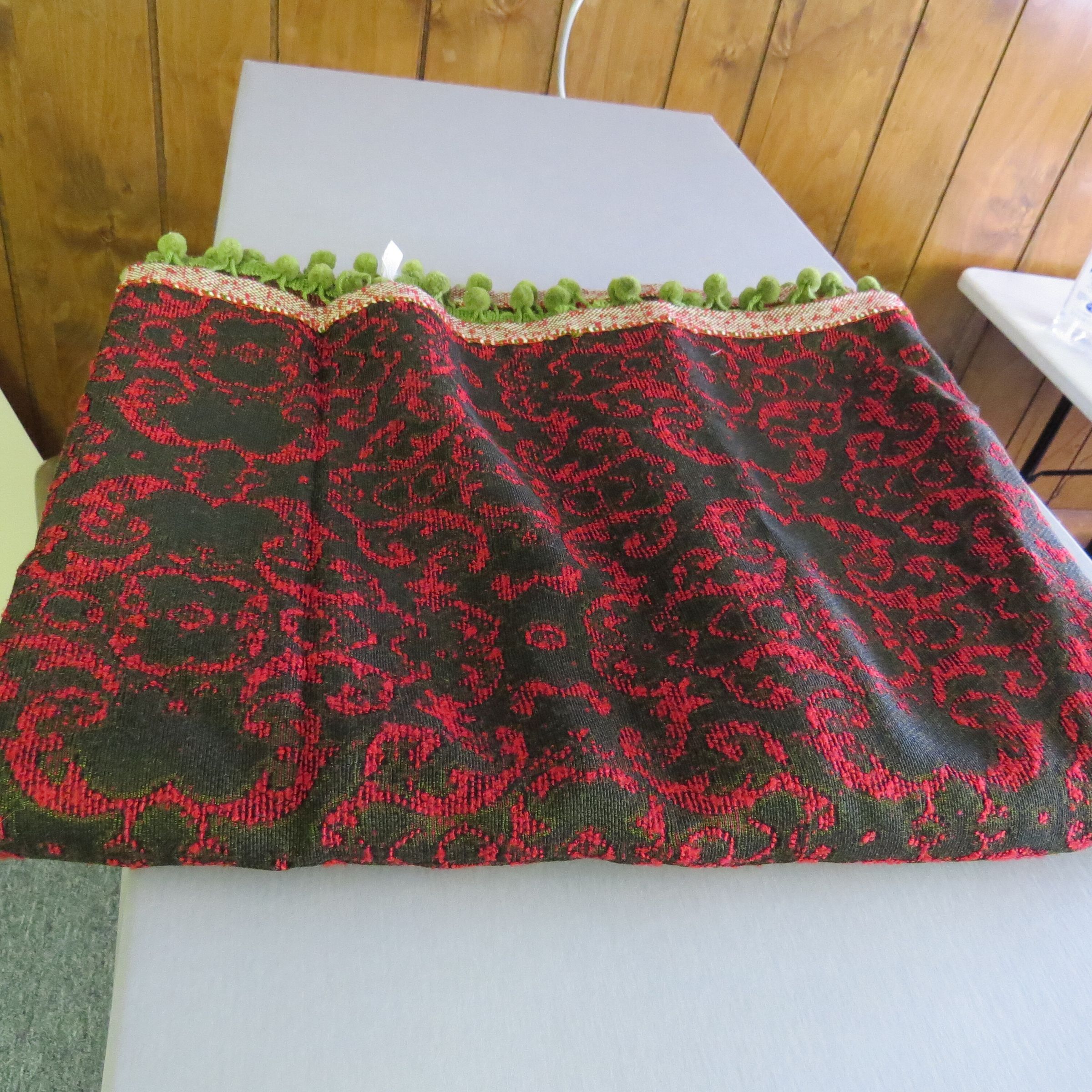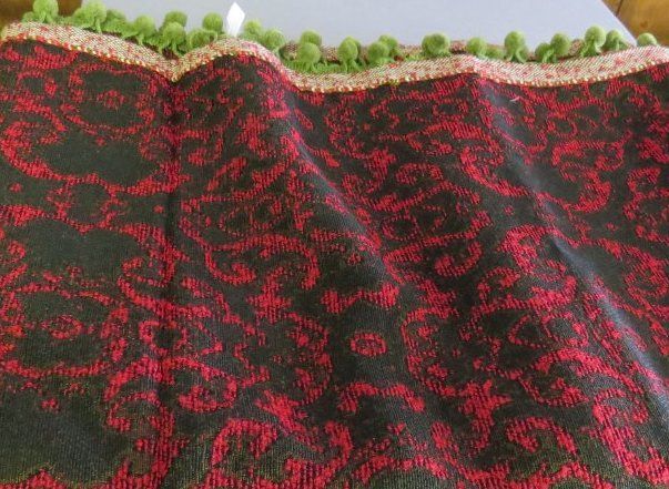 This is a thick red and green tapestry woven tablecloth with lime green pom-pom fringe on edges. The tablecloth measures 44" (w) x 60" (l).