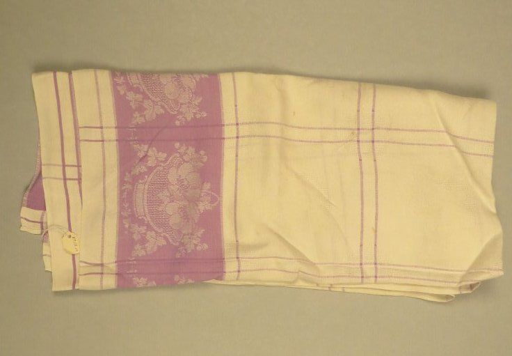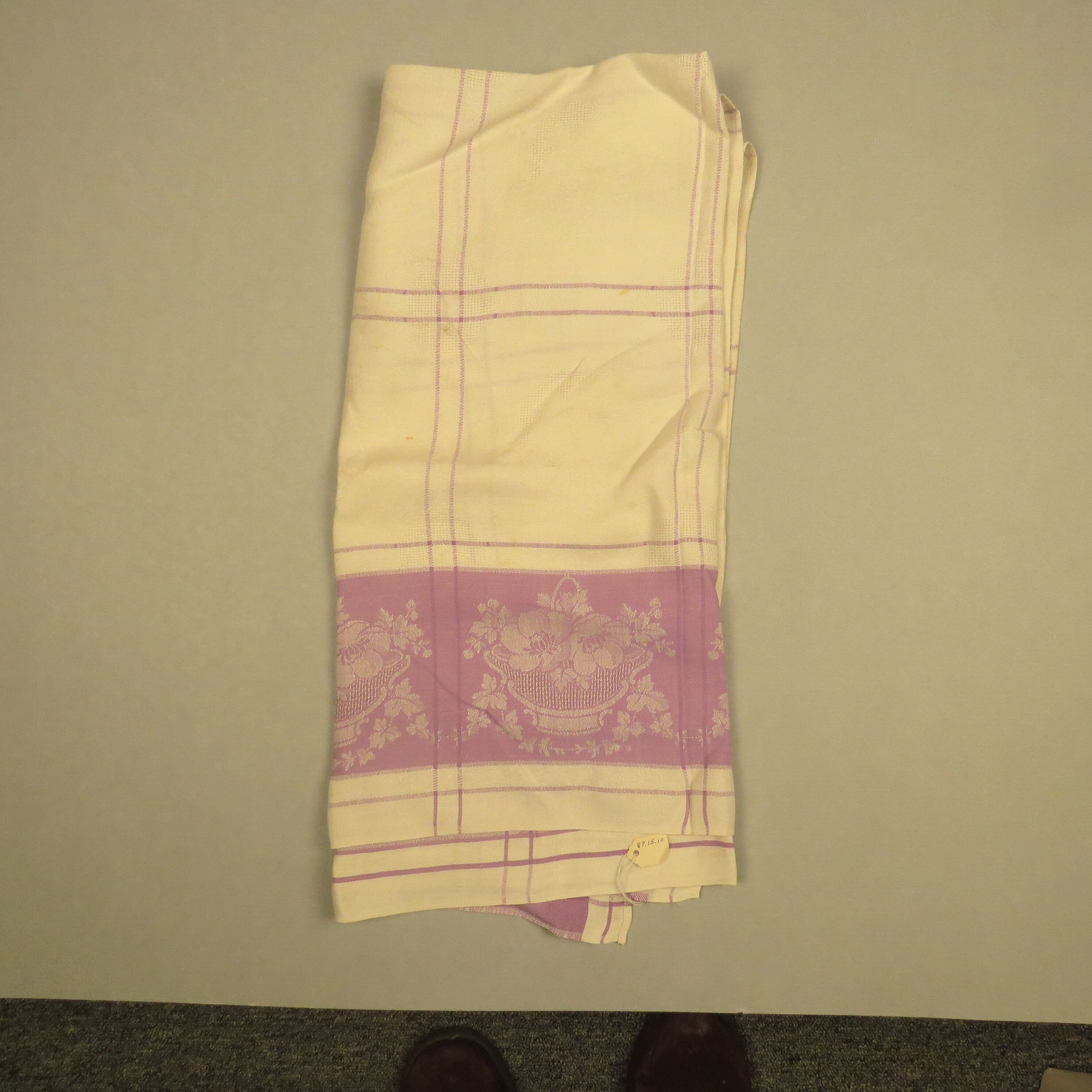 White and Purple tablecloth with thin purple stripes running vertically and horizontally and thick purple stripe at bottom with a white pattern in relief. Tablecloth measures 51" (w) x 57" (l).