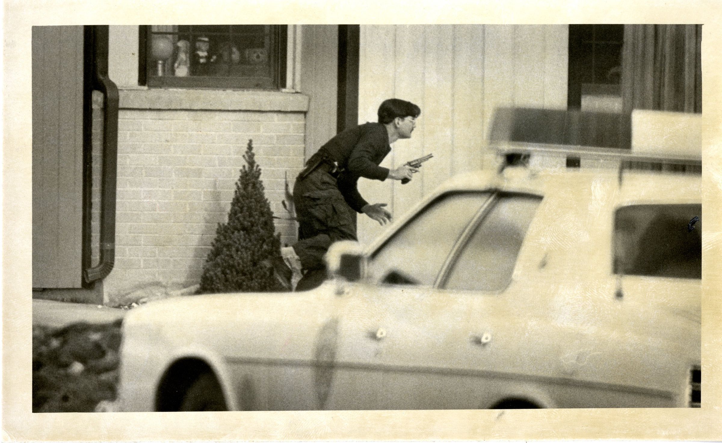 Police officer or security guard holding gun, alert pose Police car in foreground