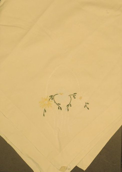 This is a white cotton tablecloth with embroidery on the corners of a basket and yellow flowers. The tablecloth measures 45" (w) x 48" (l).