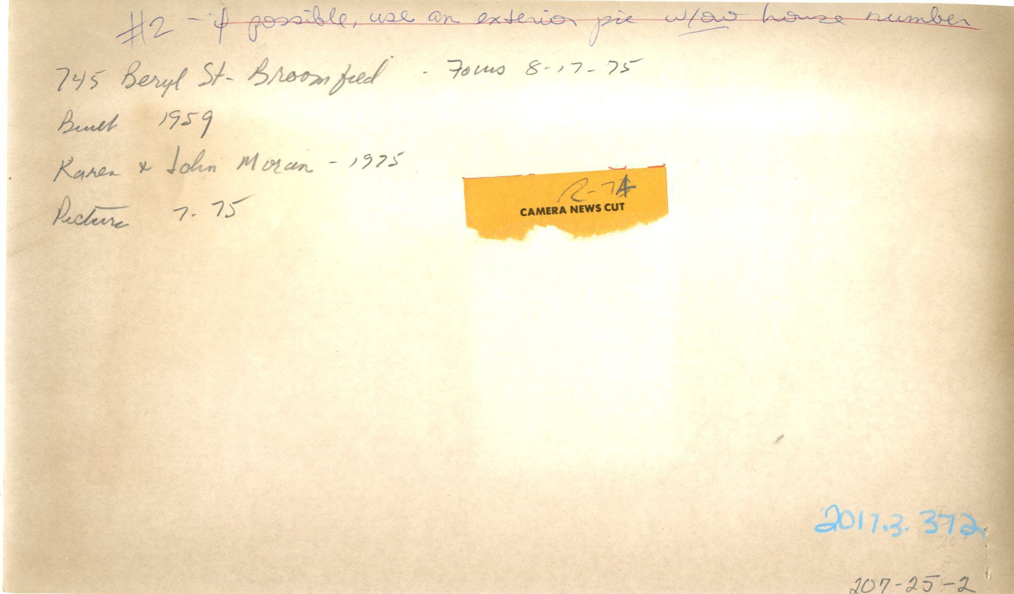 Exterior photo of house at 745 Beryl Street Broomfield. Built in 1959 . Karen and John Moran 1975.