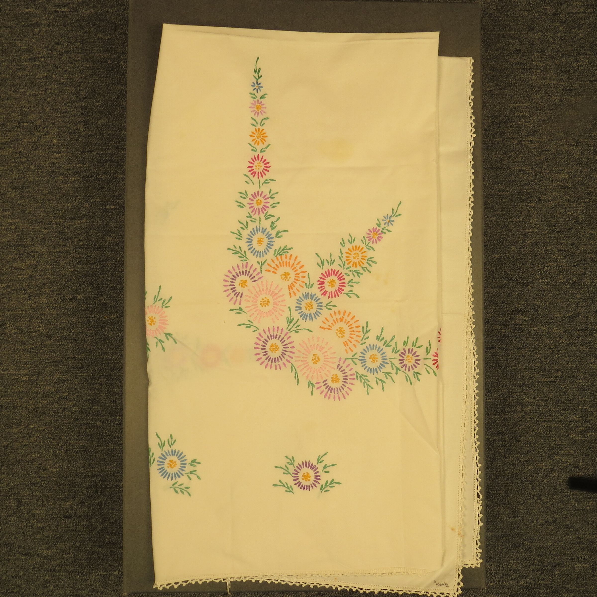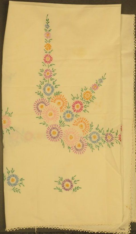 White tablecloth with colorful embroidery of flowers and crochet trim. Tablecloth measures 50" (w) x 53" (l).