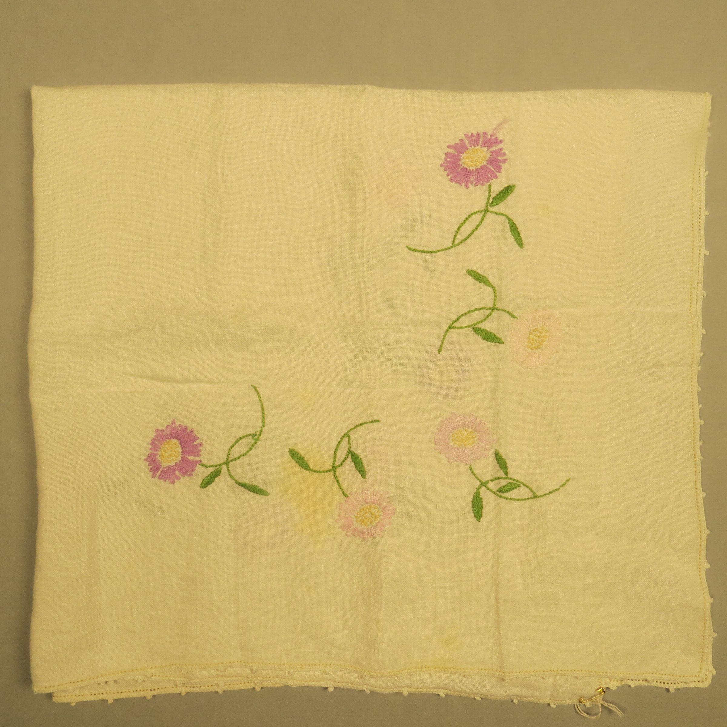 White cotton tablecloth with purple, pink and yellow flowers and green leaves in the corners. Tablecloth measures 30" (w) x 30" (l).