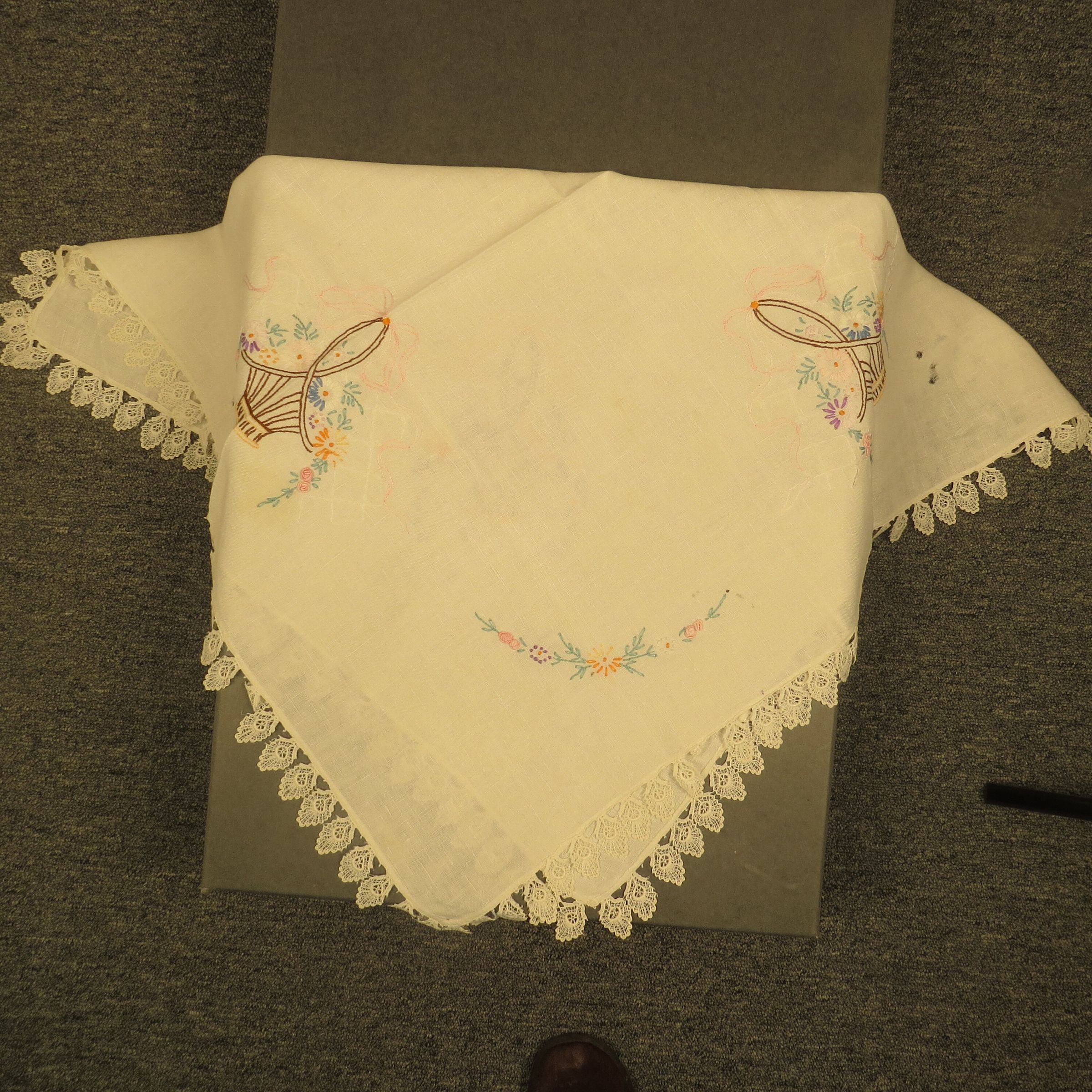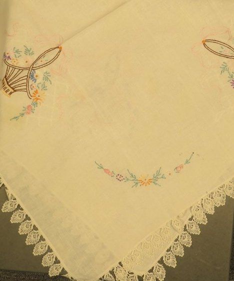 This is a white tablecloth with intricate trim around the outside and embroidery of baskets and flowers around the edges. Tablecloth measures 33" (w) x 33" (l).