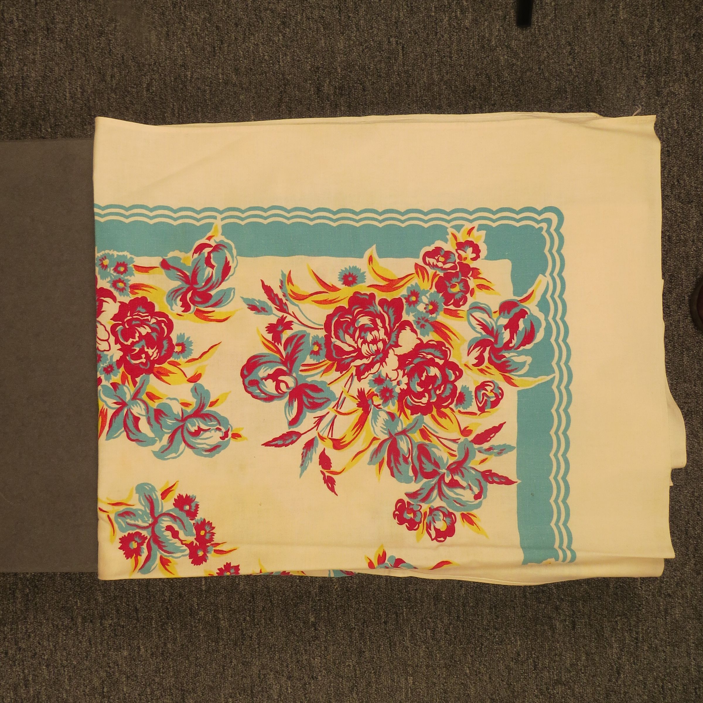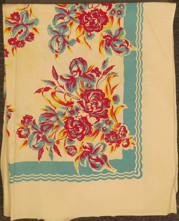 This is a white tablecloth with a vibrant printed design of flowers in maroon, teal and yellow. The tablecloth has a teal border. The tablecloth measures 45" (w) x 48" (l).