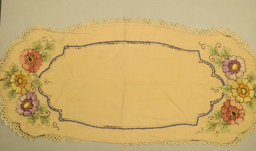 This is an oblong table runner with irregular edges. There are embroidery flowers at both ends and a blue line of wool embroidery that is concentric to the outside lines. There is a crocheted trim around the outside. The table runner measures 18" (w) x 44" (l).