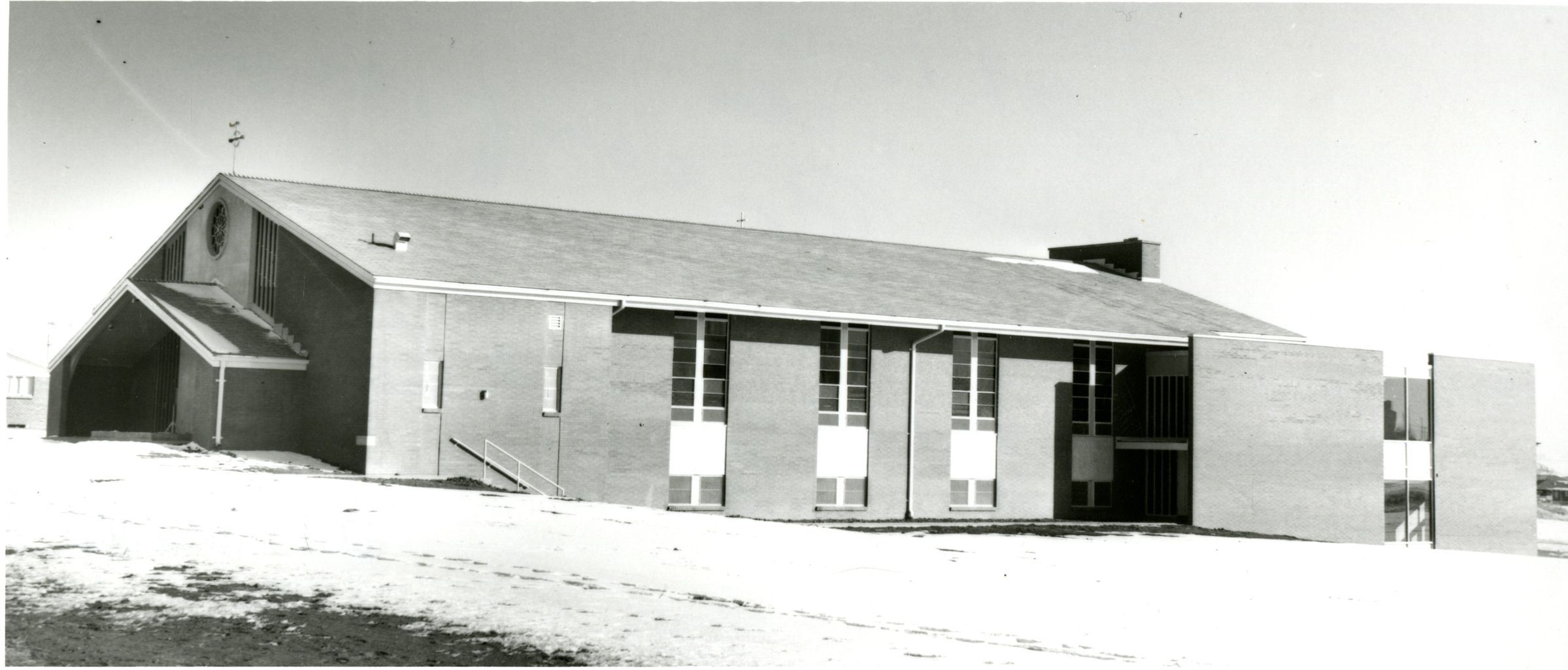 Exterior photo of the Catholic Church in Broomfield, Nativity of Our Lord. Dated 1961. Building looks brand new with no landscaping aruond the building. View is likely looking northeast, with the west side of building facing the viewer.Collection