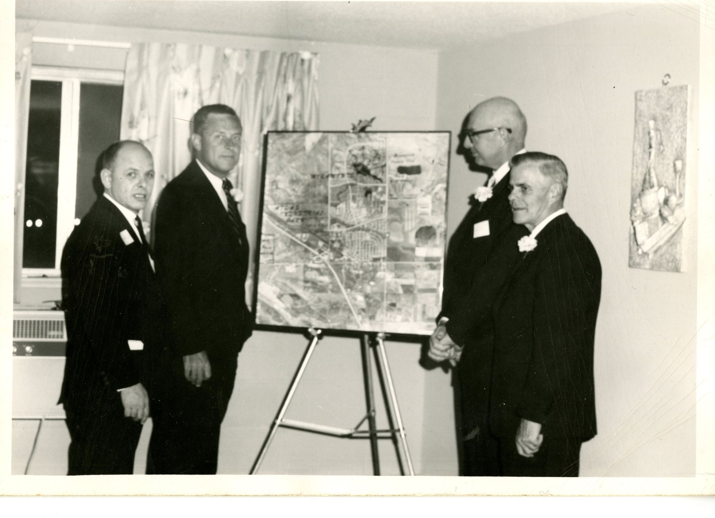 Four men looking at a map of Broomfield. David James front left. Don Descombs front right. Ed Juliber most likely is the tall bald man. David James was 1st Treasurer of the Chamber of Commerce.