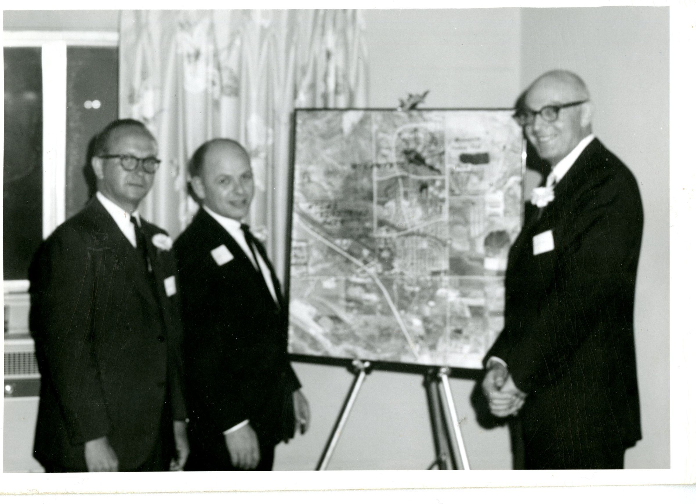 Three menn looking at a map of Broomfield. On the left is David James and on the right is possibly Ed Juliber. Third man ID is unknown.