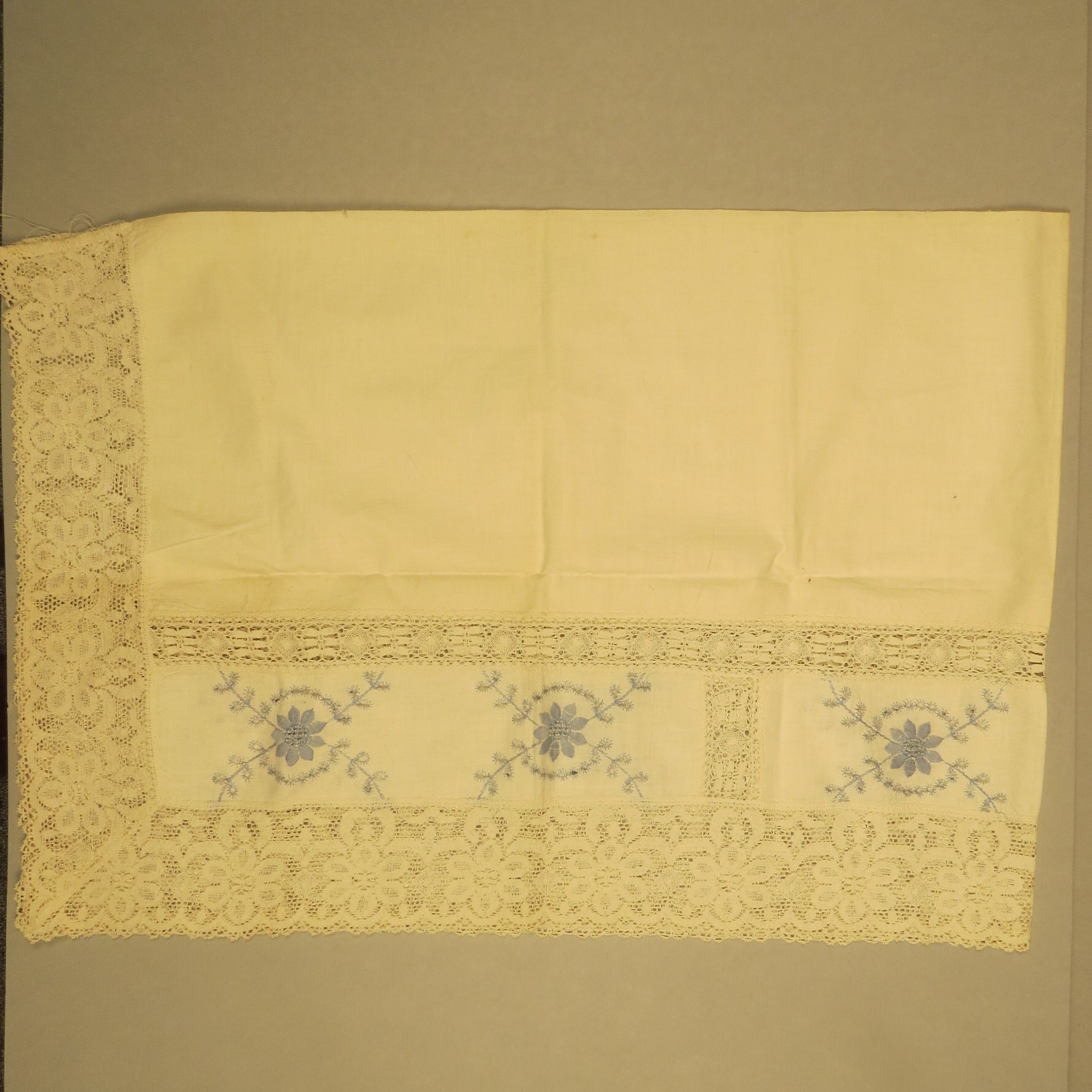 White tablecloth with wide lace trim around the outside and blue embroidery accents. There are also lace insets on top of the blue trim. Tablecloth measures 20" (w) x 50" (l).
