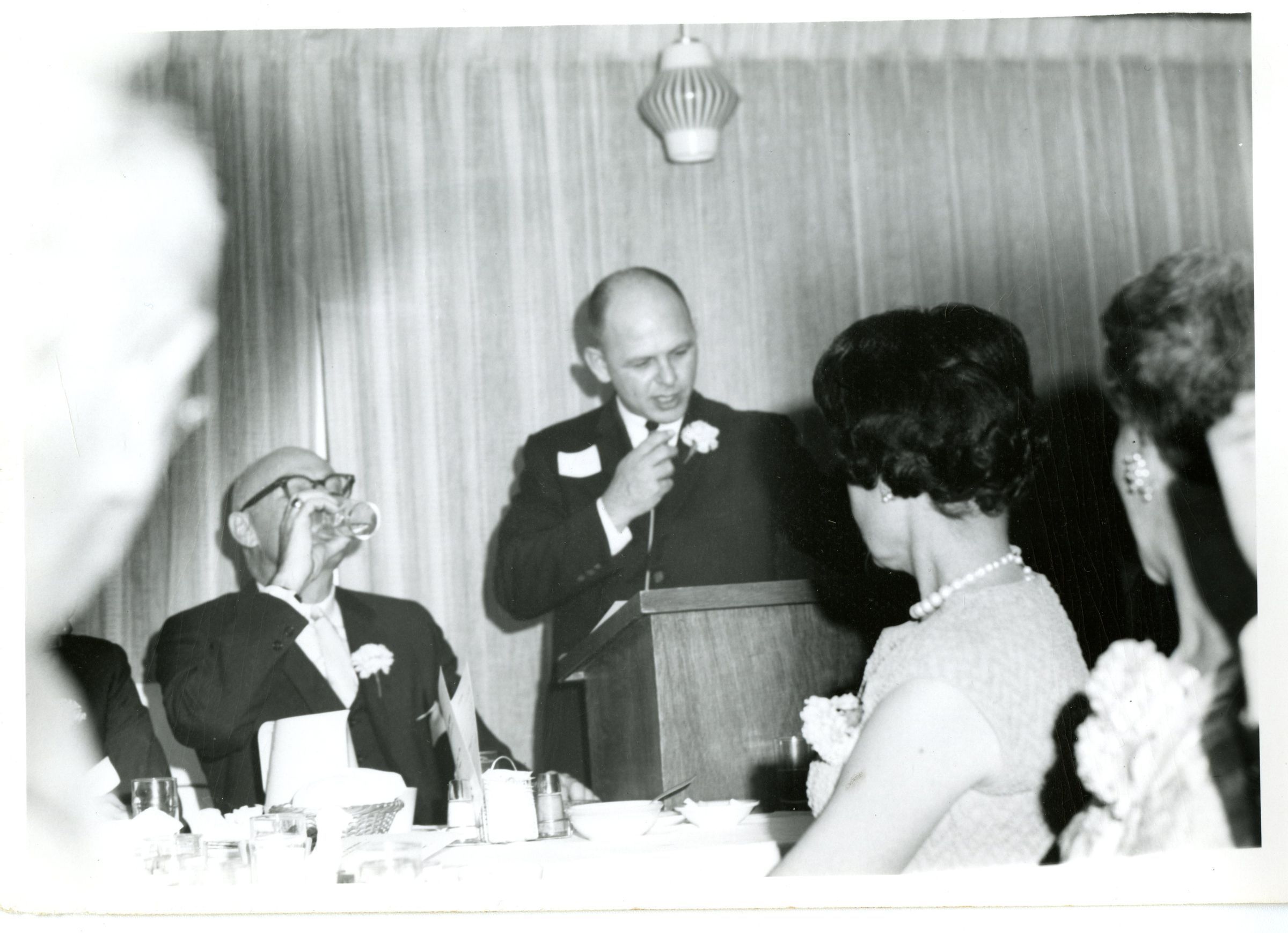 David James addressing a group of people. Possibly Ed Juliber is seated next to the podium.