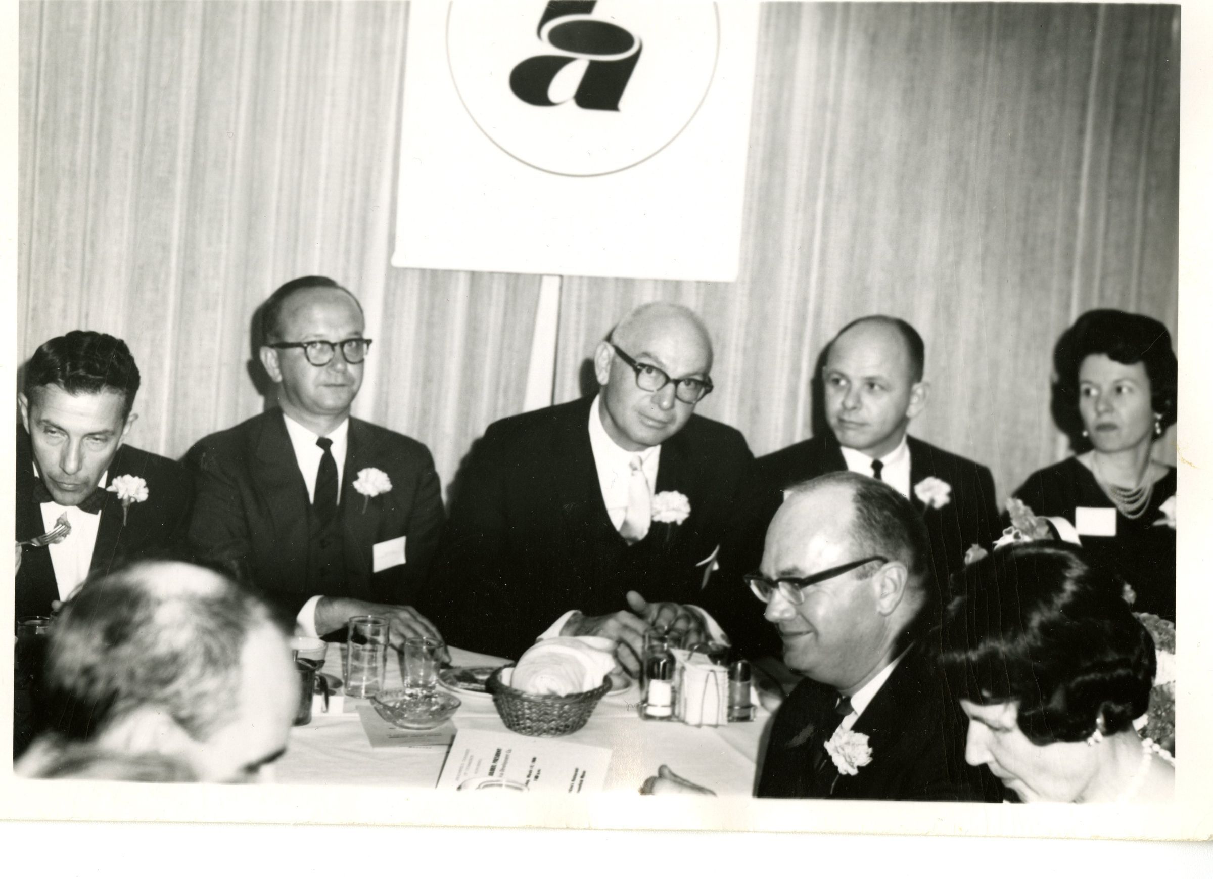 A group of people seated at a table awaiting either lunch or dinner. Two of the men at the table are David James and possibly Ed Juliber.