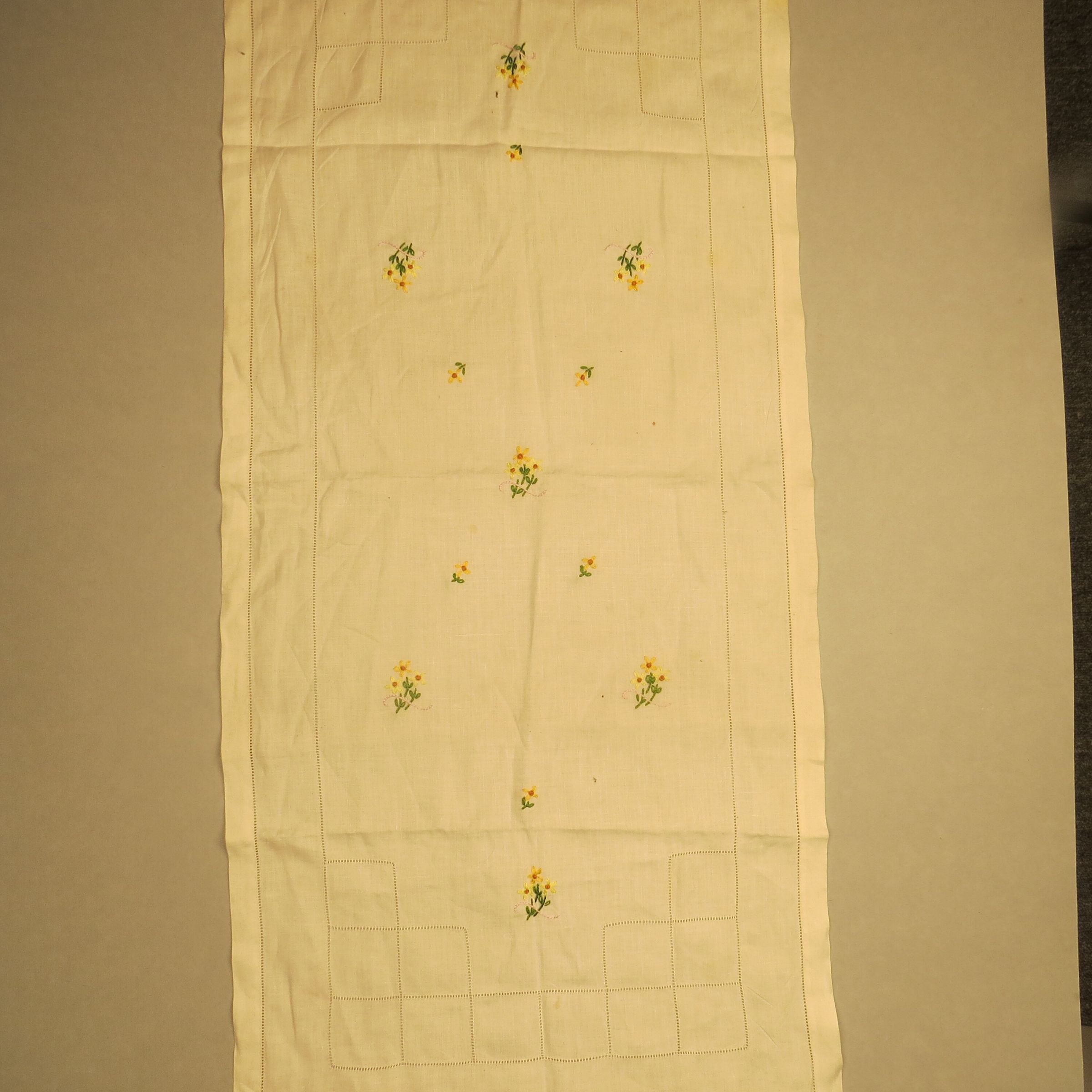 This white furniture runner is long and skinny in shape. Hemstiching has been used in a decorative grid pattern. There are small yellow embroidered flowers with green leaves scattered throughout the center of the runner. The furniture runner measures 15" (w) x 30" (l).