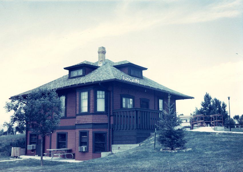 Colored photograph of the Broomfield Depot Museum in Zang Spur Park. Picture taken facing north west. Faded.