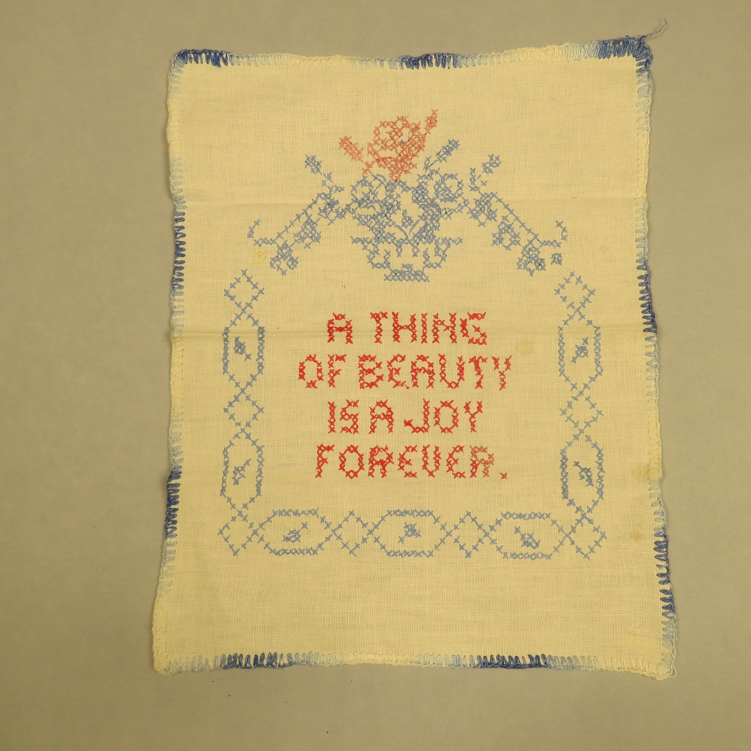 White cotton rectangle with blue variegated yarn around outside and a quote embroidered with red in the middle "A THING OF BEAUTY IS A JOY FOREVER" The quote is surrounded by blue embroidery with a red flower at the top. Cross-stitch measures 10" (w) x 13" (l).