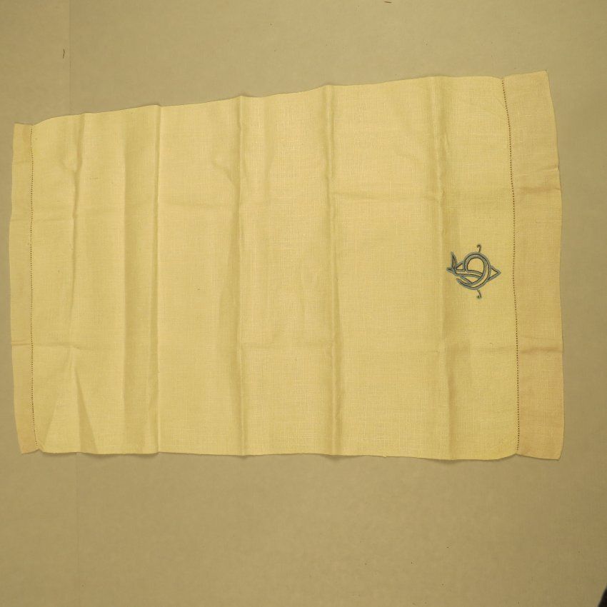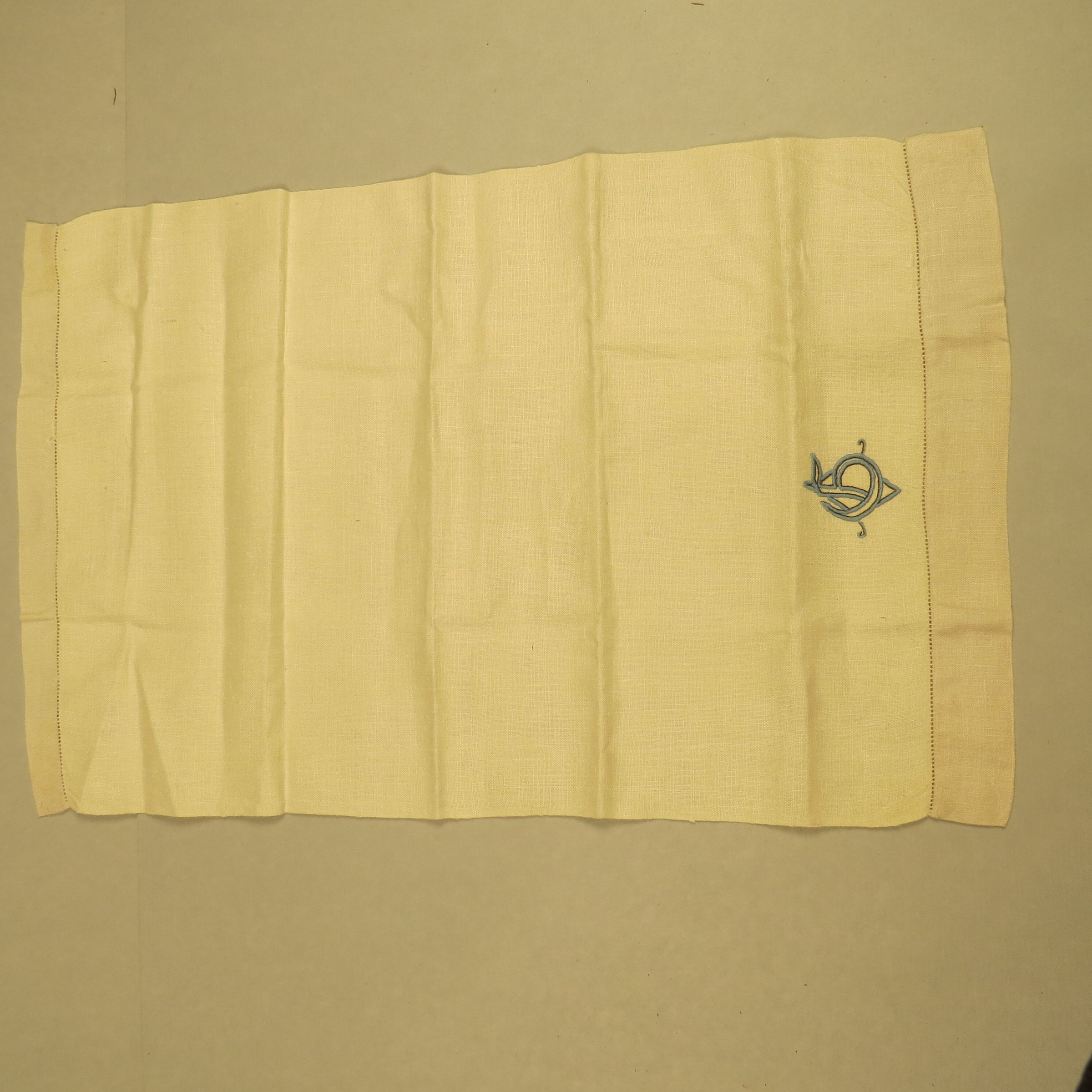 May be pillowcase or hand towel. Glazed or calendared cotton or linen blend with a crisp hand. The towel is rectangular with deep hemstitched short edges. On one side there is a very intricate blue and black embroidered insignia, likely initials of some kind. Towel measures 17" (w) x 27" (l).