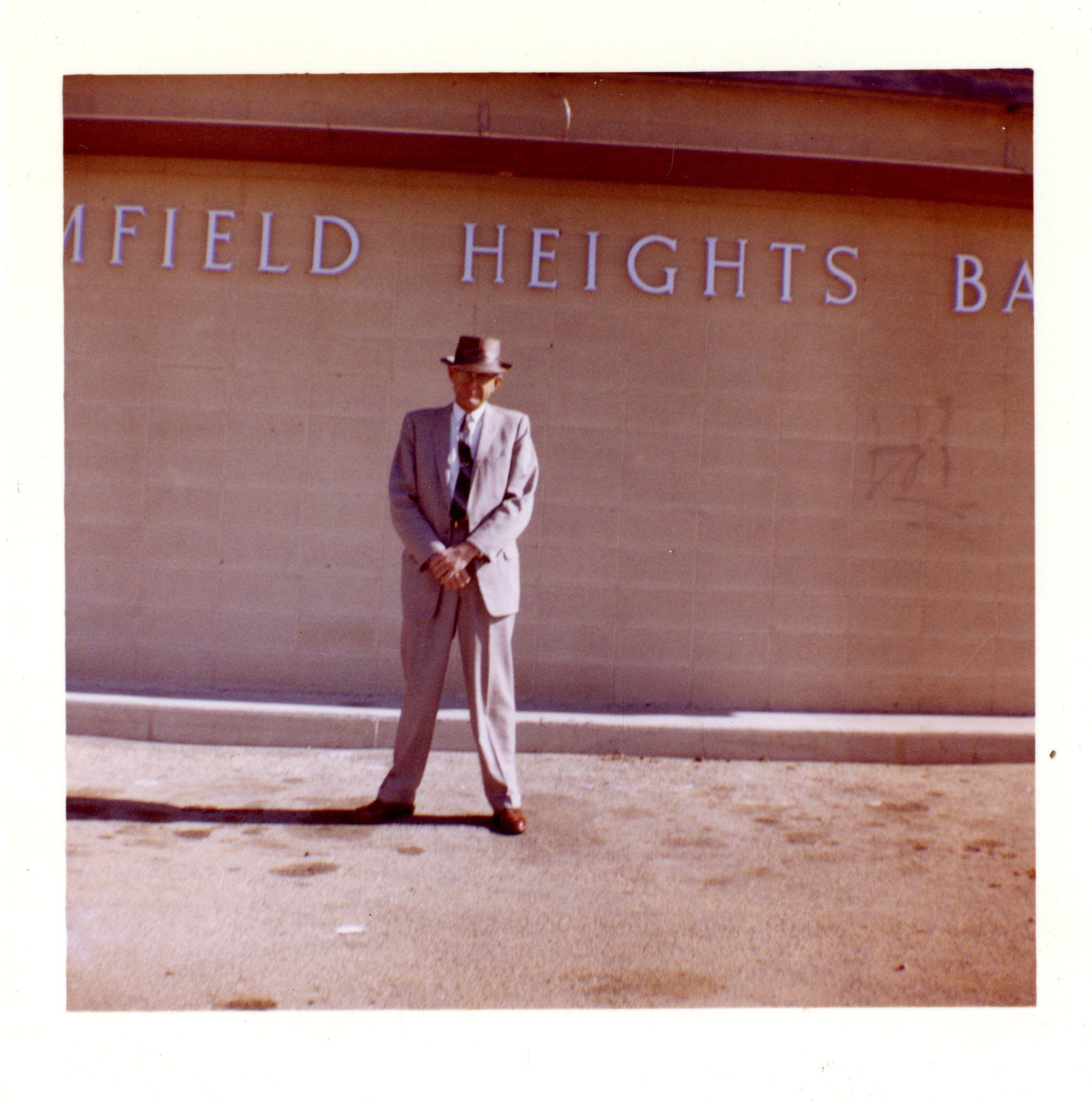 Colored photo of man standing in front of Broomfield Heights Bank sign Garden Center Ken Hoyle?