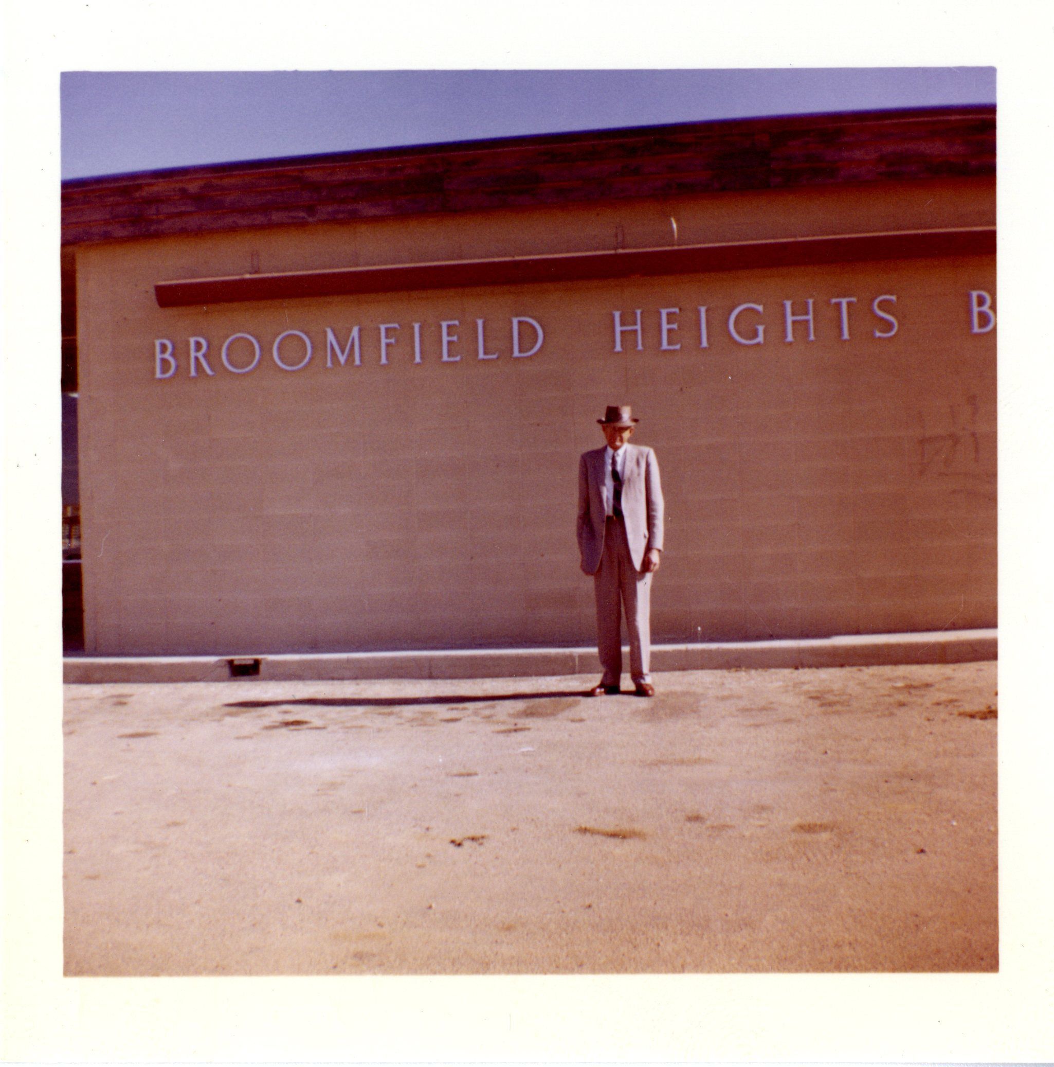 Color photo of man standing in front of Broomfield Heights Bank building. Garden Center Ken Hoyle?