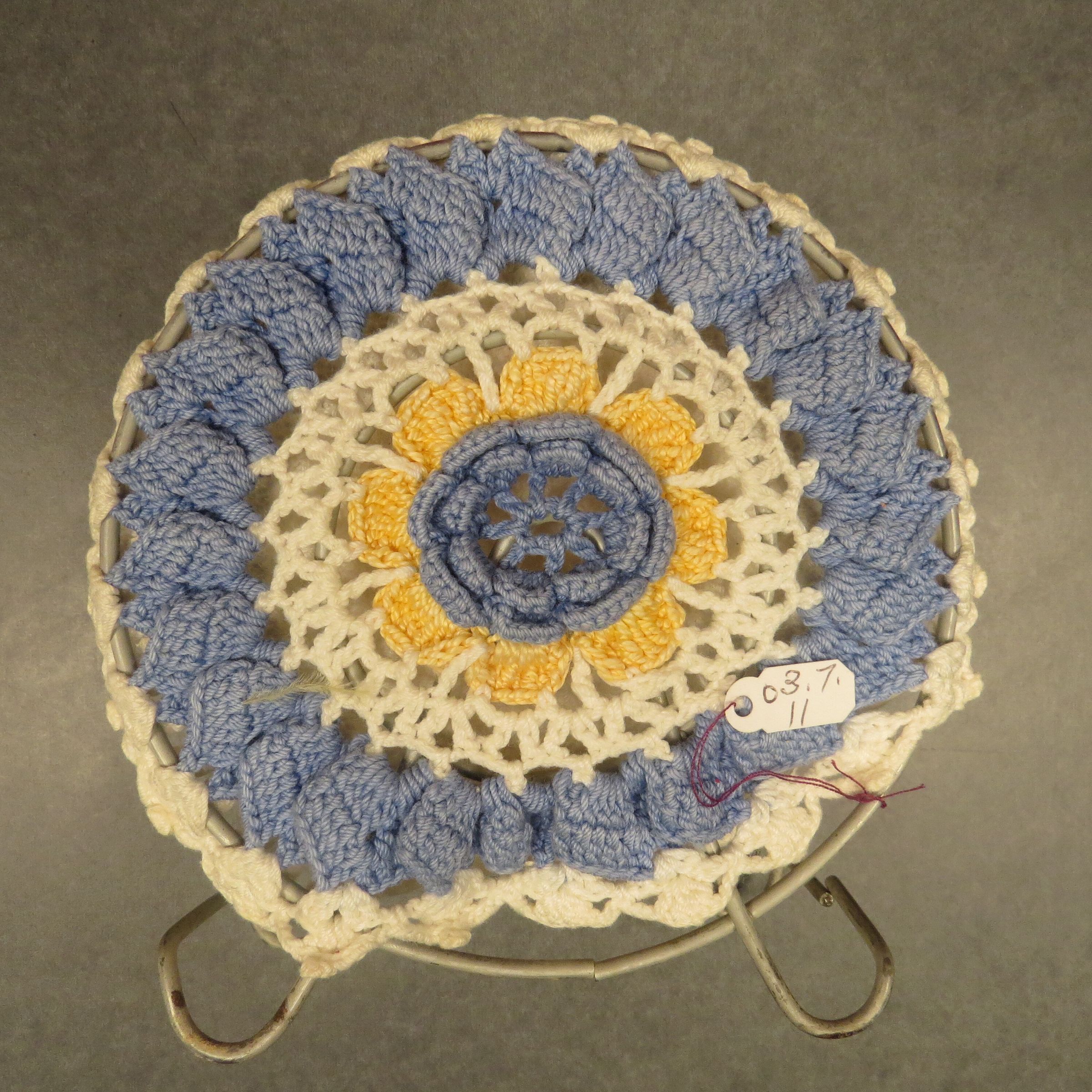 Wire napkin holder decorated on both sides with a circular crocheted doily covering the wire. The doily is of blue, yellow and white cotton yarn. The napkin holder measures 5.5" (dia).