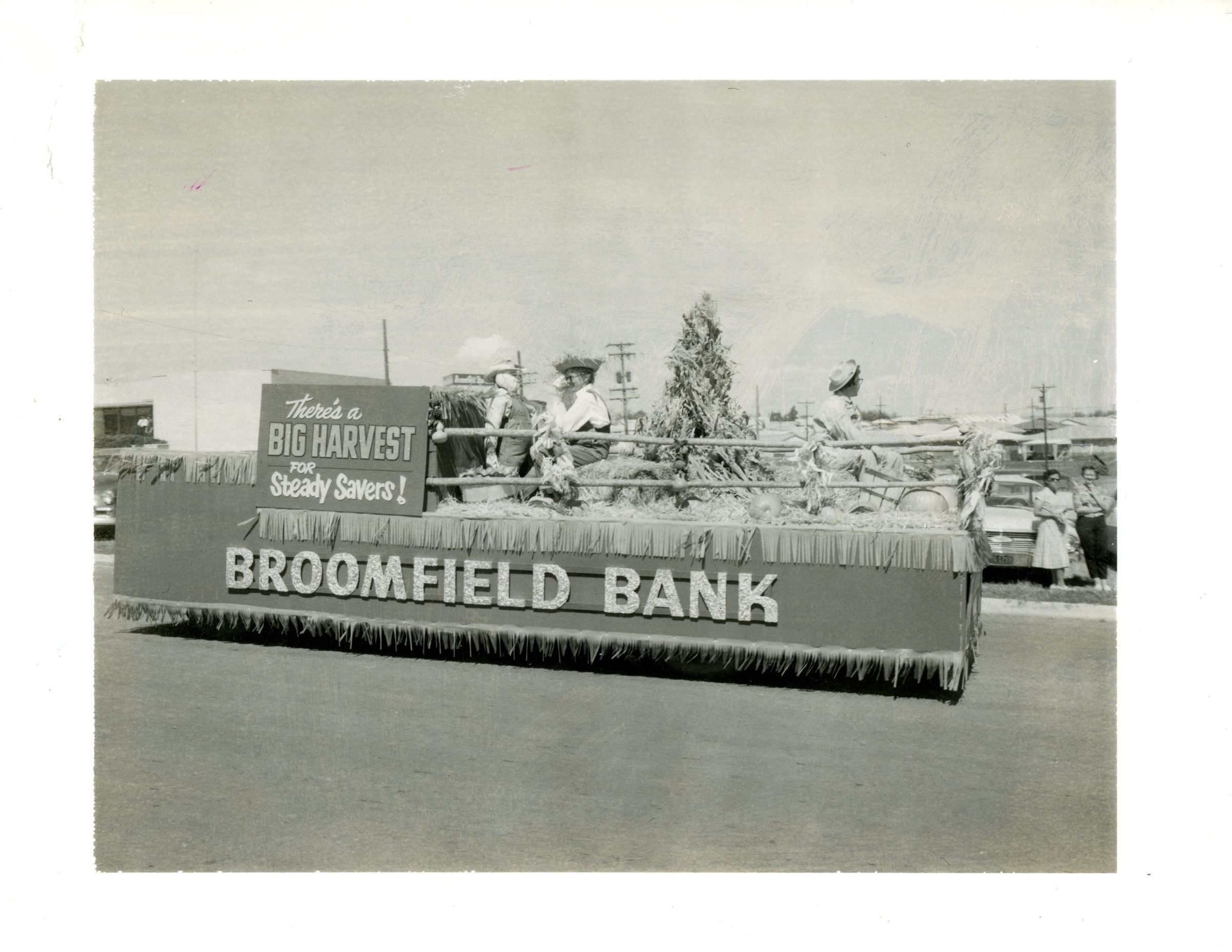 Black and white polaroid photo of Broomfield Bank parade float. Sign on float says "There's a big harvest for steady savings!" People are riding on float. Garden Center? Broomfield Days?