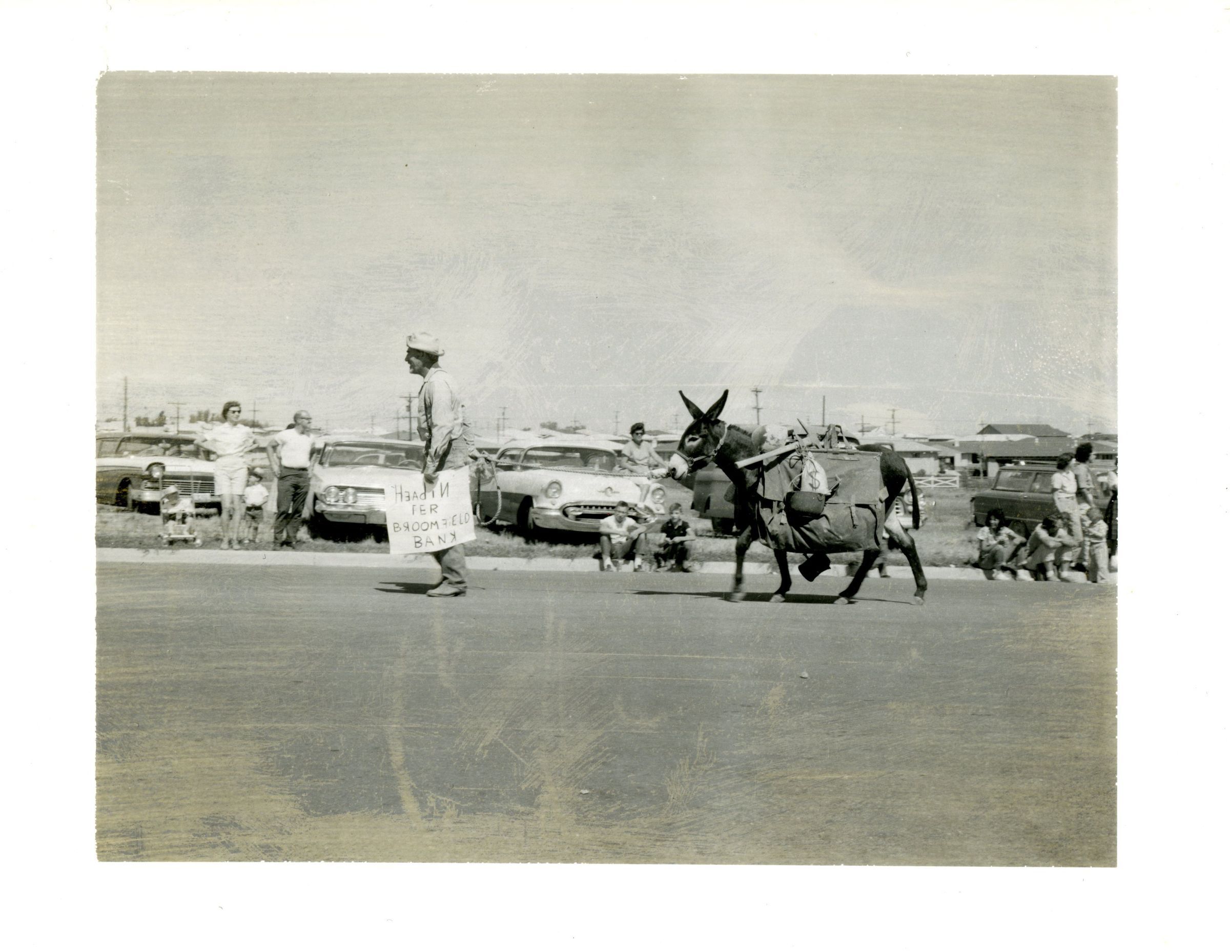 Black and white polaroid photo of man holding sign that says Broomfield Bank, He is pulling a donkey by a rope. People are sitting on curb and standing on sidewalk in front of parking lot. Garden Center? Broomfield Days?