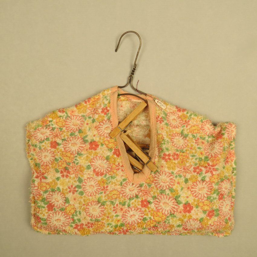 Floral printed terrycloth pocket hanging from a wire hanger. There is a slot on one side near the top of the hanger for clothespins to go in and come out. The clothespin holder measures 24" (h) x 16" (w).