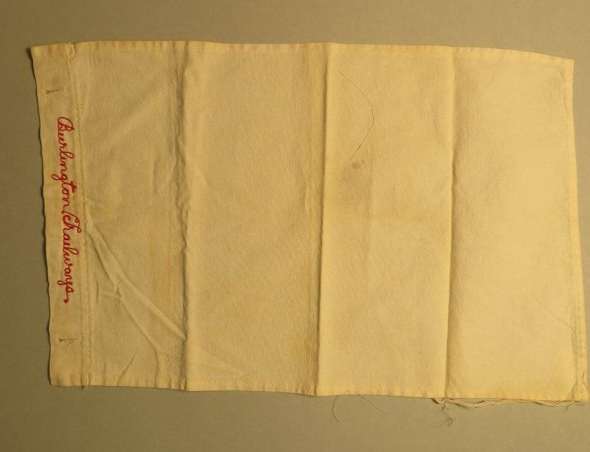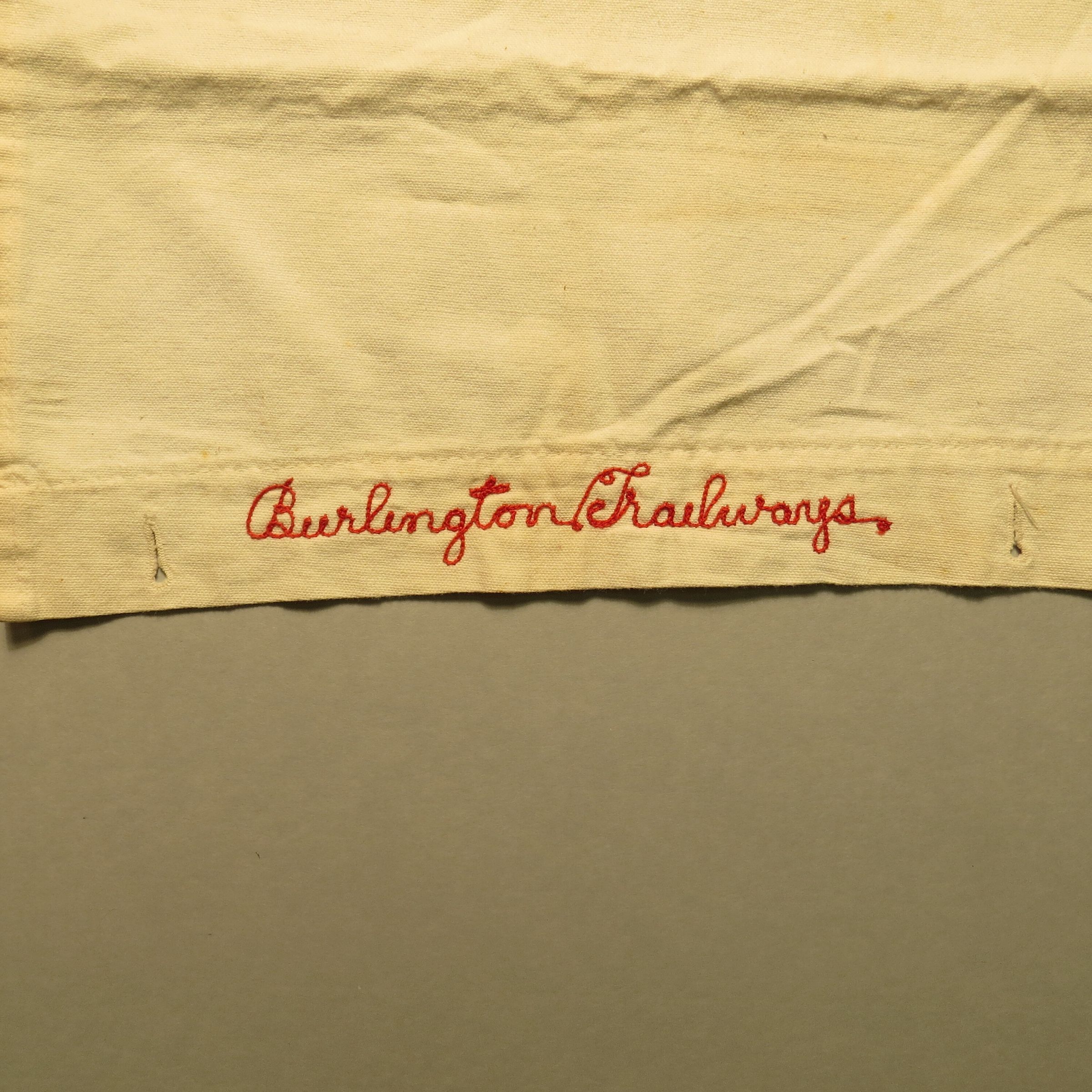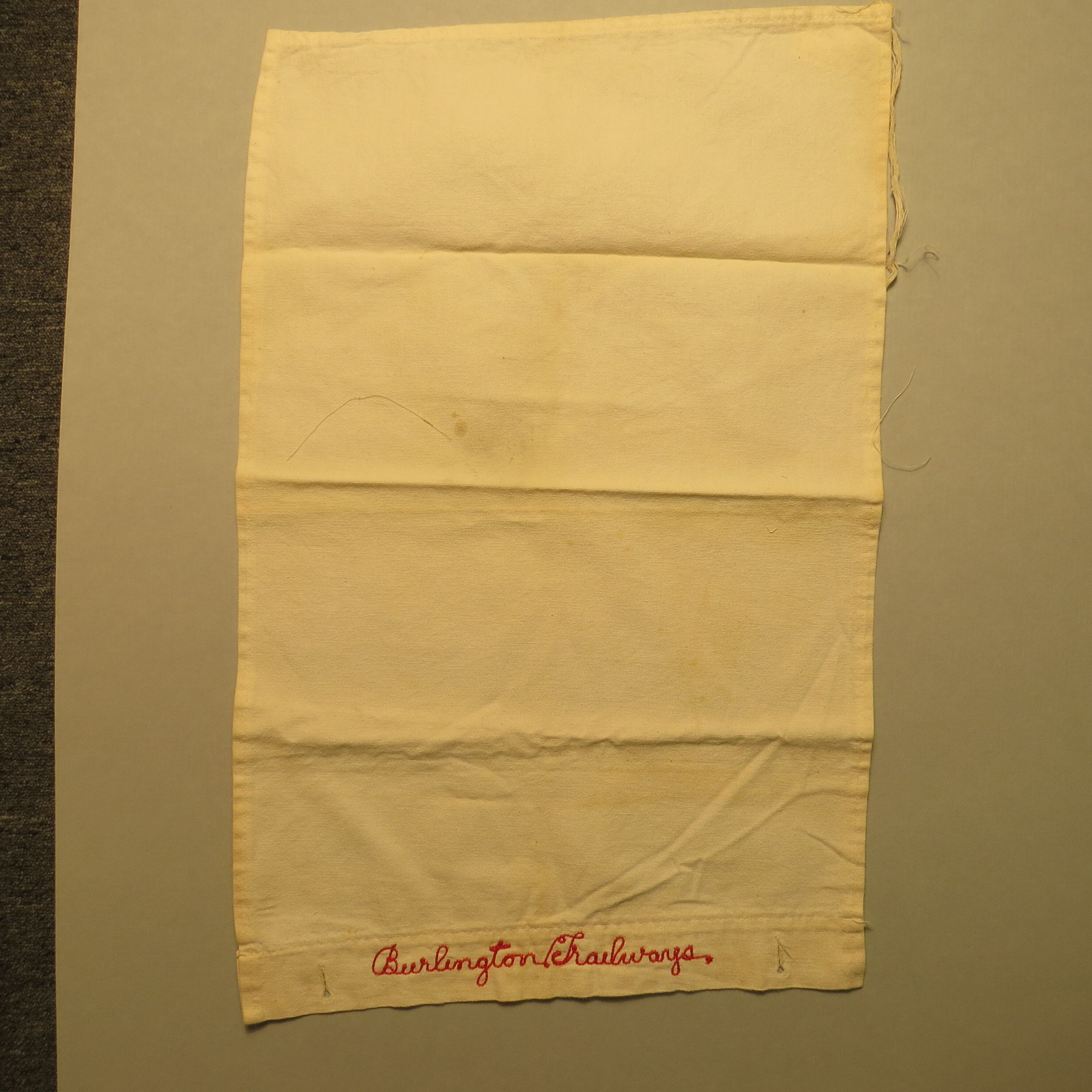 White cotton towel-sized piece of material that has a hem with buttonholes and an embroidered "Burlington Trailways" along one of the short ends.