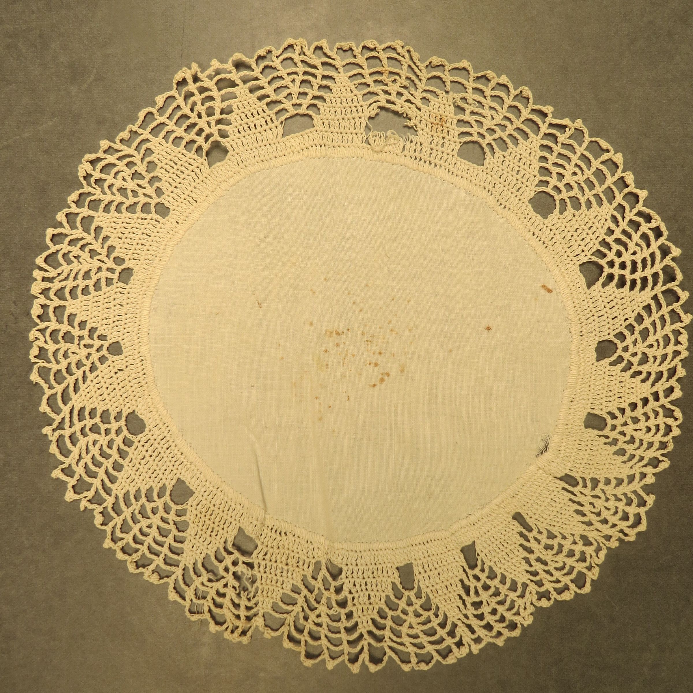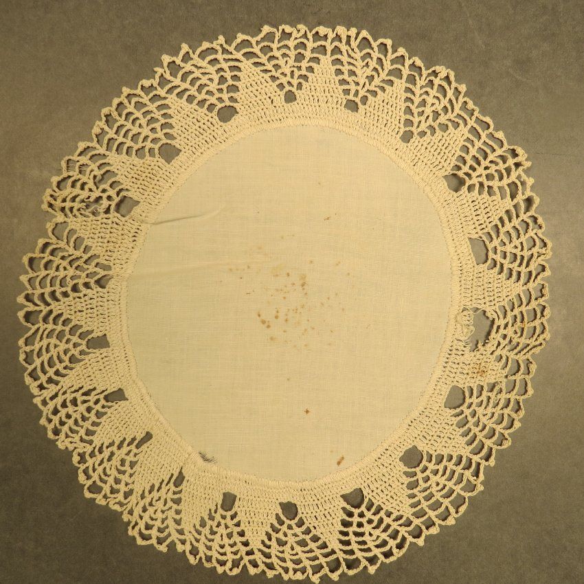 Tan muslin center and wide crocheted lace trim around outside in shape of triangles. The doily measures 9" (dia).