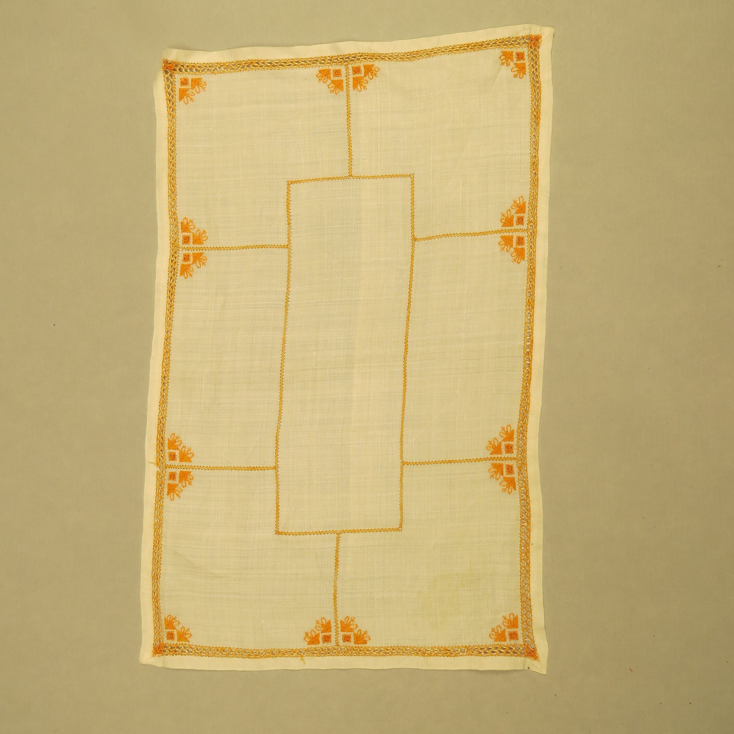 Rectangular piece of cotton with yellow embroidery in grid pattern with abstract leafy designs in the corners of the gridwork. The doily measures 17" (w) x 10.5" (l).