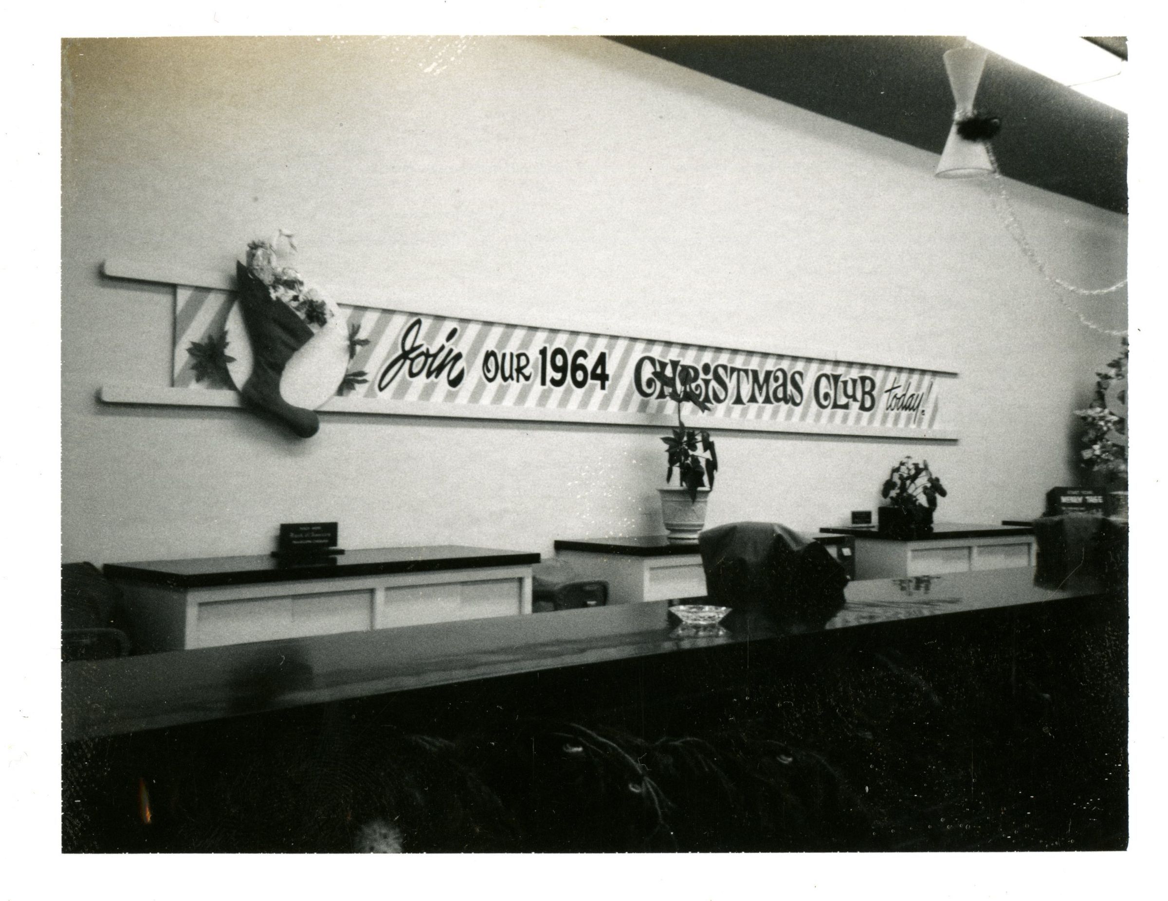 Black and white polaroid of bank lobby decorated for Christmas. Banner reads "Join our 1964 Christmas Club today!." Broomfield Bank