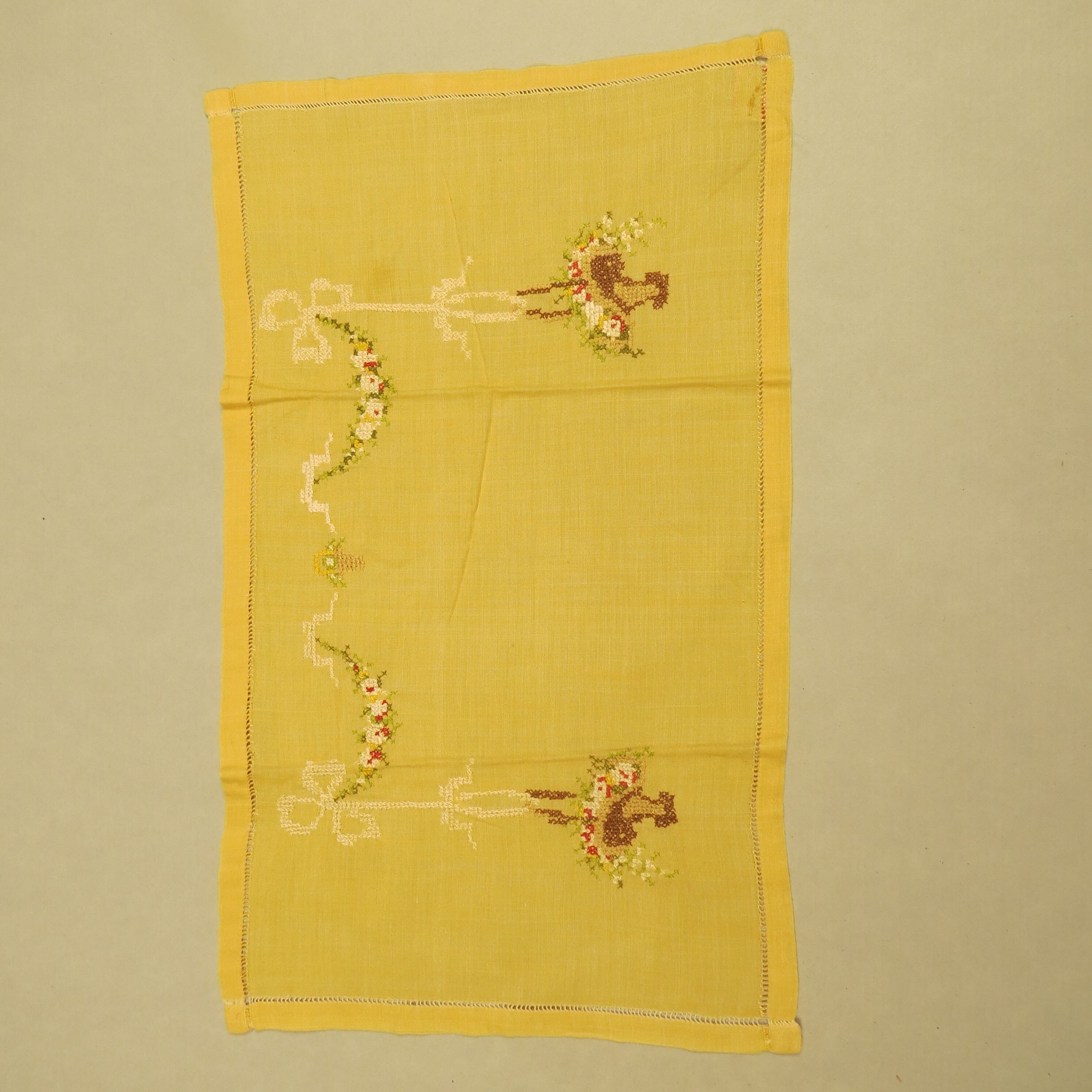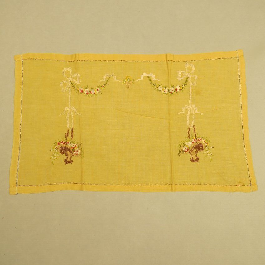 Yellow material (likely cotton) doily with symmetrical design of baskets of flowers with ribbons and floral swags above. The edge has been hemstitched. The doily measures 17" (w) x 10" (l).