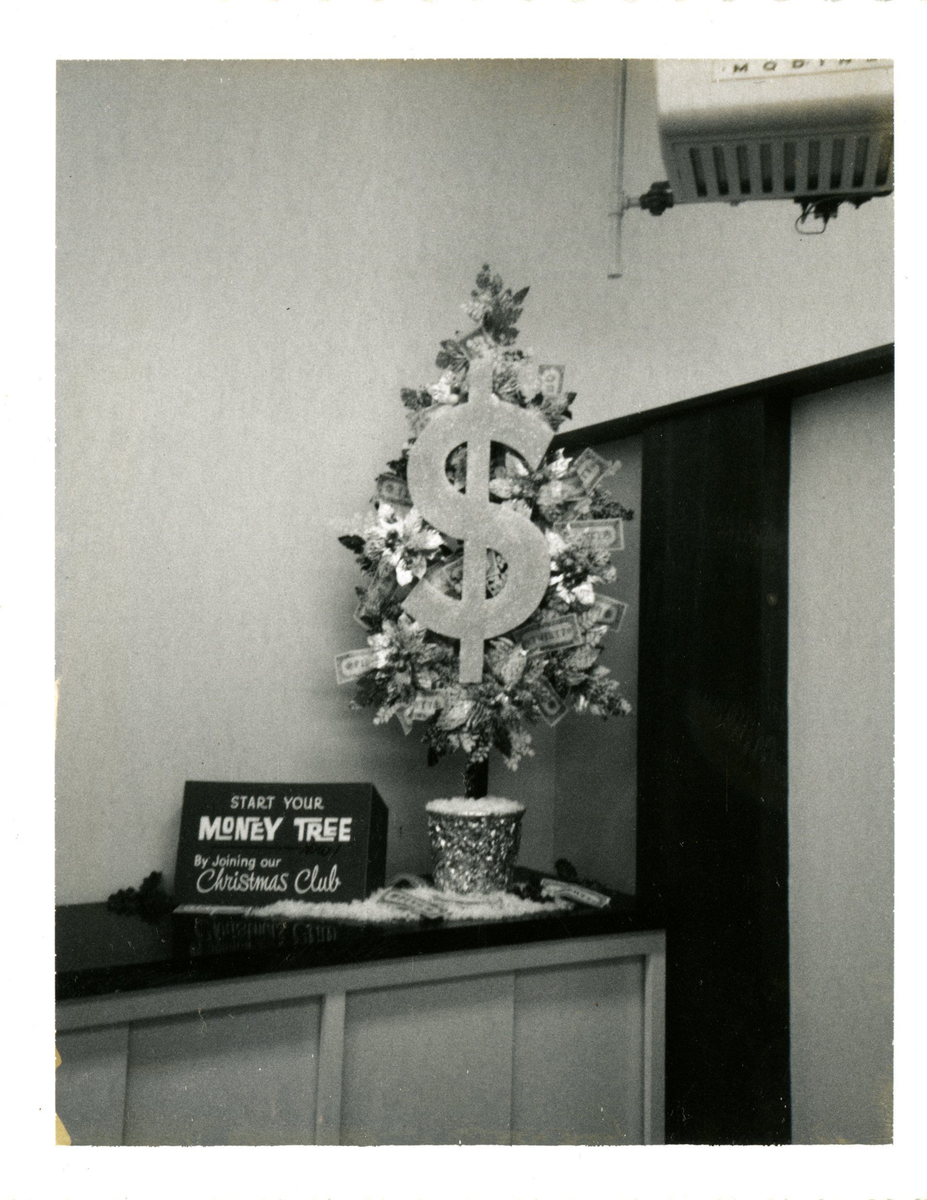 Black and white polaroid photo of bank lobby decorated for Christmas. Small Christmas tree decorated with dollar sign. Sign ready "Start your money tree by joining our Christmas Club. Broomfield Bank