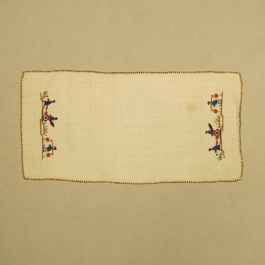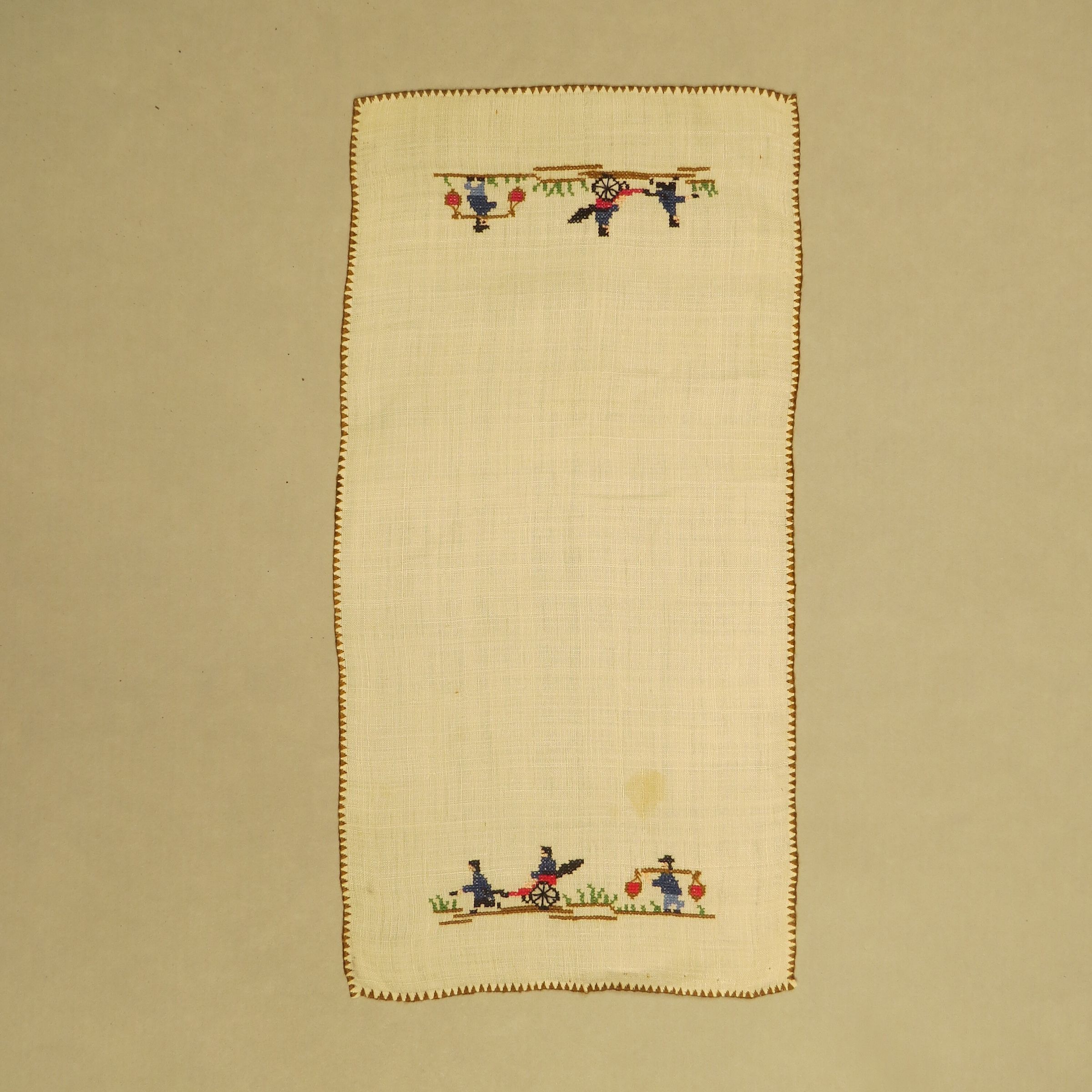 Small white cotton rectangle doily with mirrored images on the short edges of likely Chinese men in a farm setting and pulling/riding a cart. The edge has a decorative blanket stitch. The doily measures 13" (w) x 6" (l).