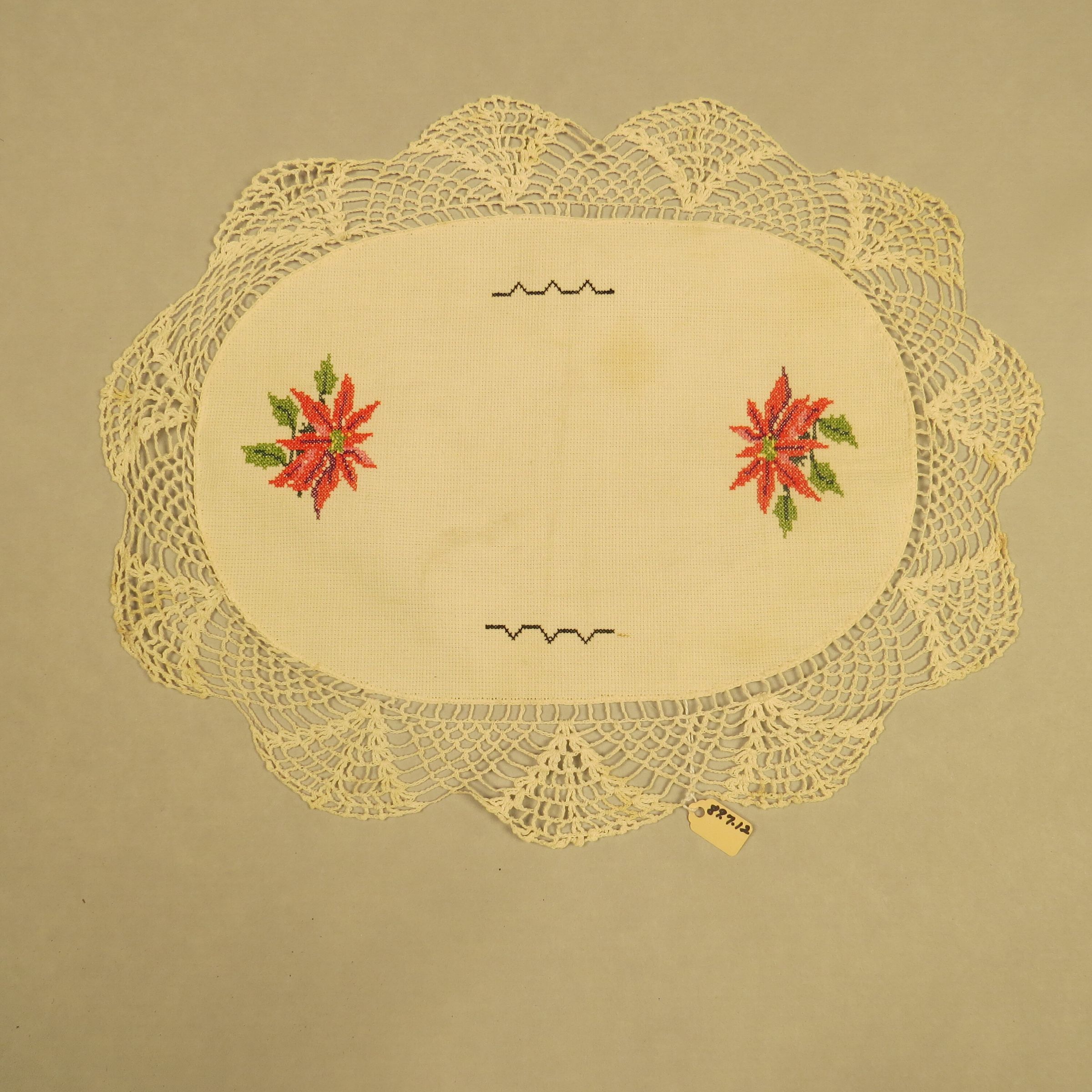 This is an oval doily made from a piece of muslin surrounded by lace. The muslin has a red flower (poinsettia) design on the two shorter ends and a black squiggle on the long ends. There is a fine wide lace surrounding the oval. The doily measures 14.5" (w) x 10" (l).