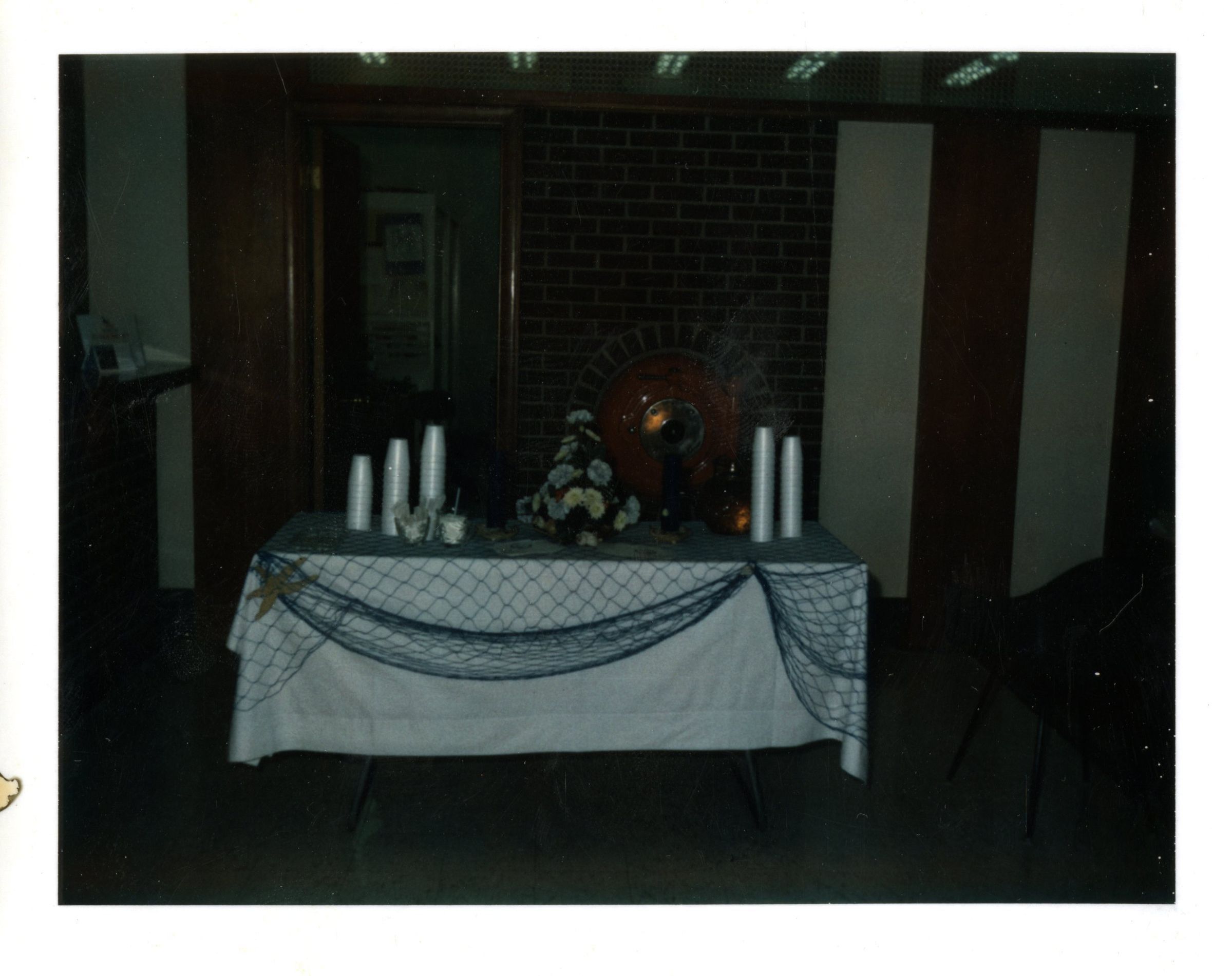 Colored photo of decorated table in bank lobby. Tenth anniversary celebration. Broomfield Bank