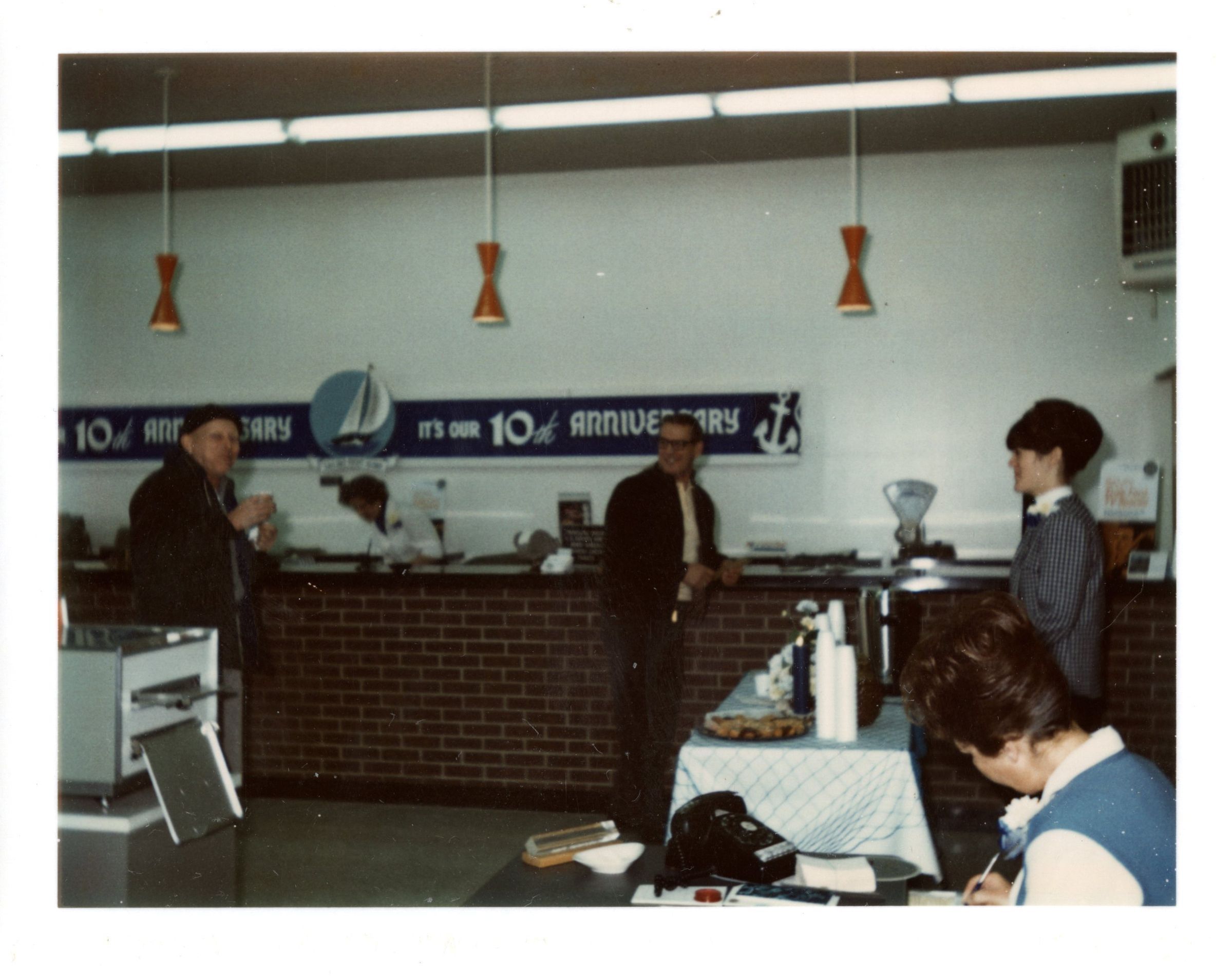 Colored photo of bank lobby decorated for tenth anniversary celebration with two men and two women. Broomfield Bank