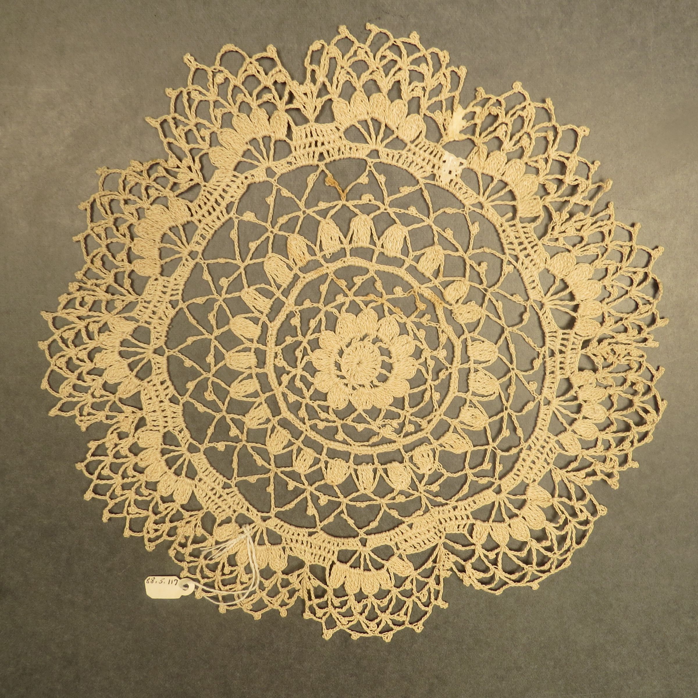 This is an off-white or tan doily with an openwork design. There is a center flower design, surrounded by small petal shapes and then an openwork grid followed by a scalloped edge of lace-y openwork. Doily measures 9" (dia).Collection