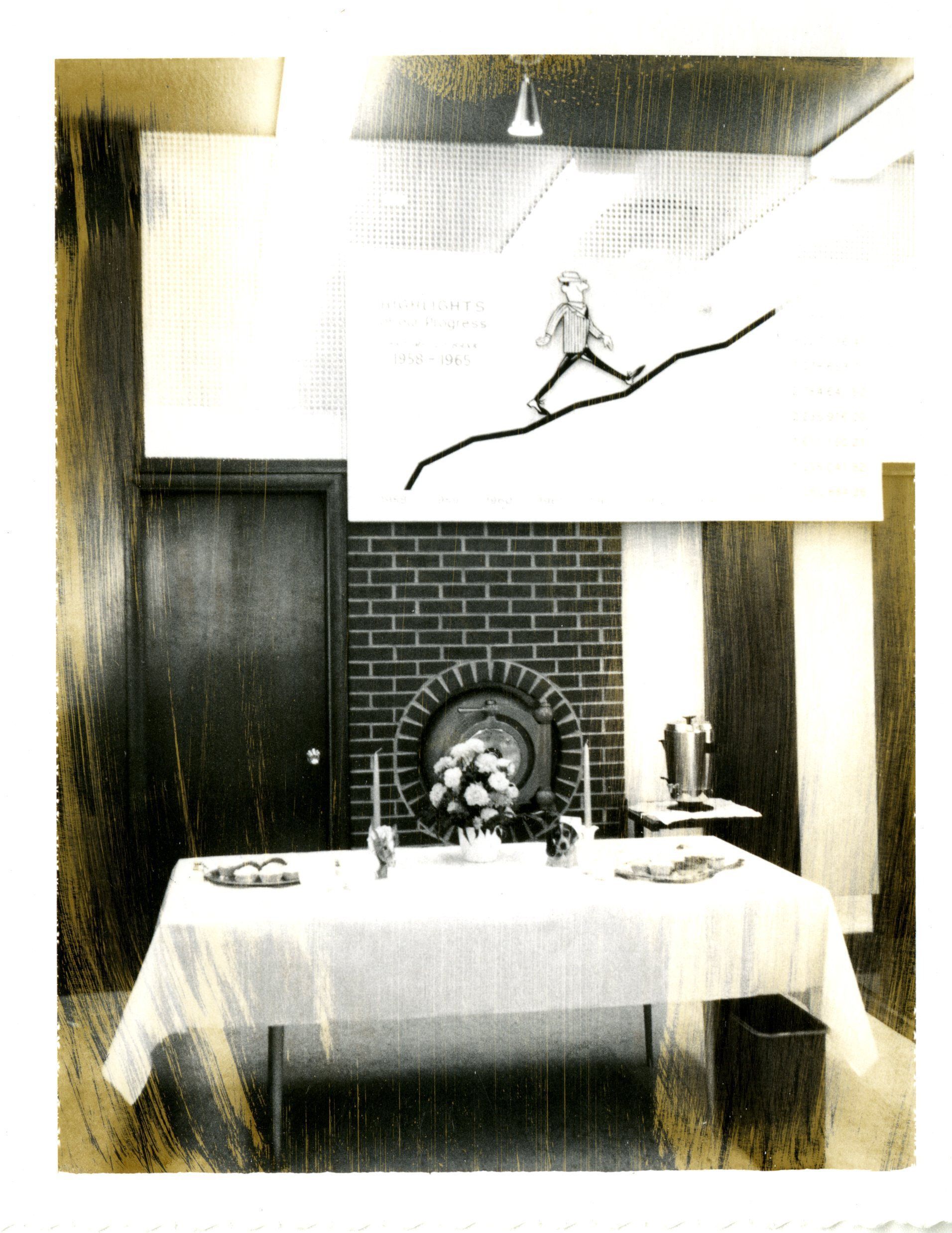 Black and white photo of bank lobby with decorated table. Broomfield Bank