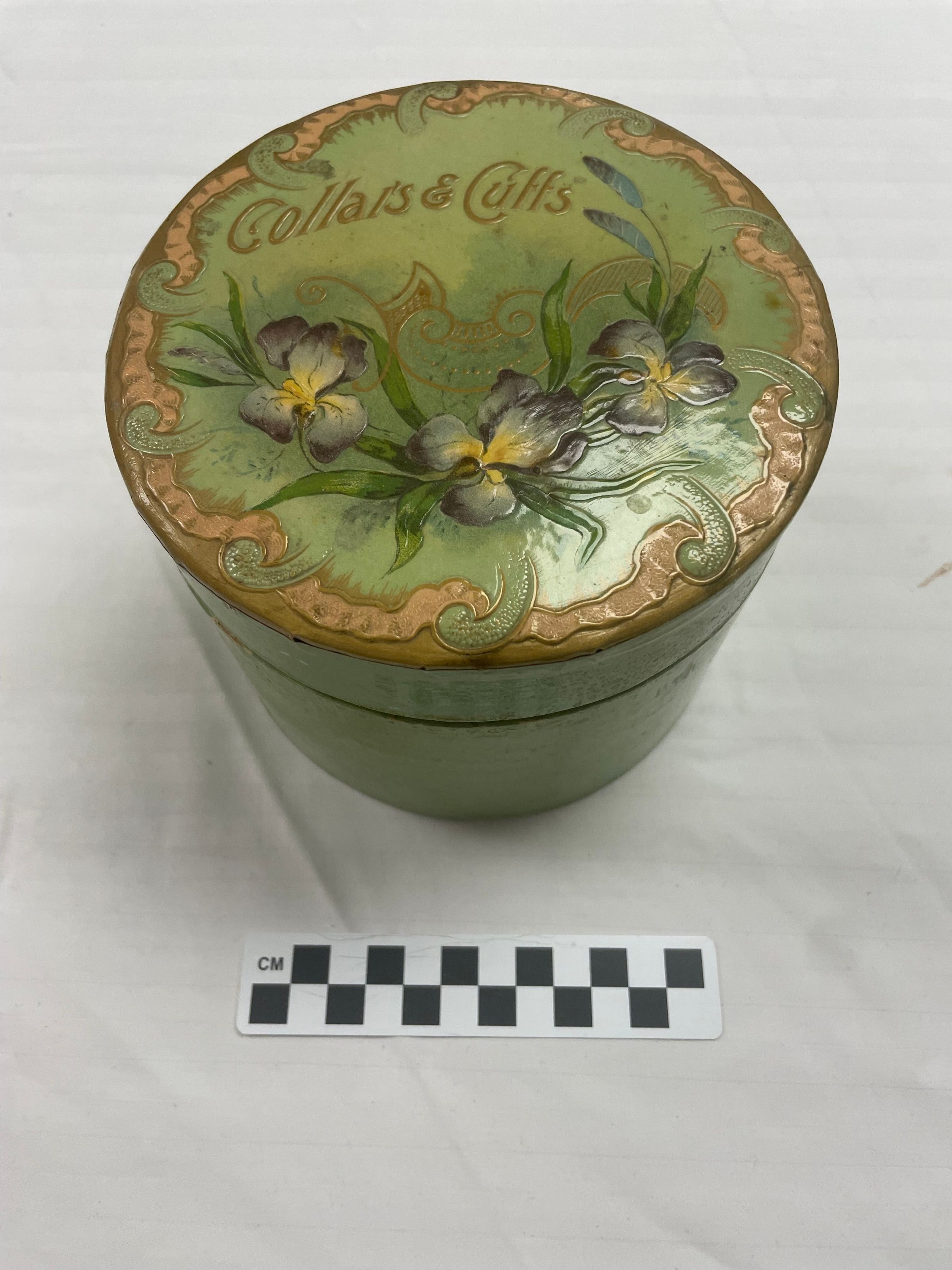 A cylindrical box of collars, collar buttons, cuffs, and cuff links. The box has an intricate design on the lid of various swirls and patterns, purple flowers with a yellow center and long, thin, green leaves coming from them, and text that reads "Collars & Cuffs" above. The box itself is made of a yellow-toned lacquered wood.