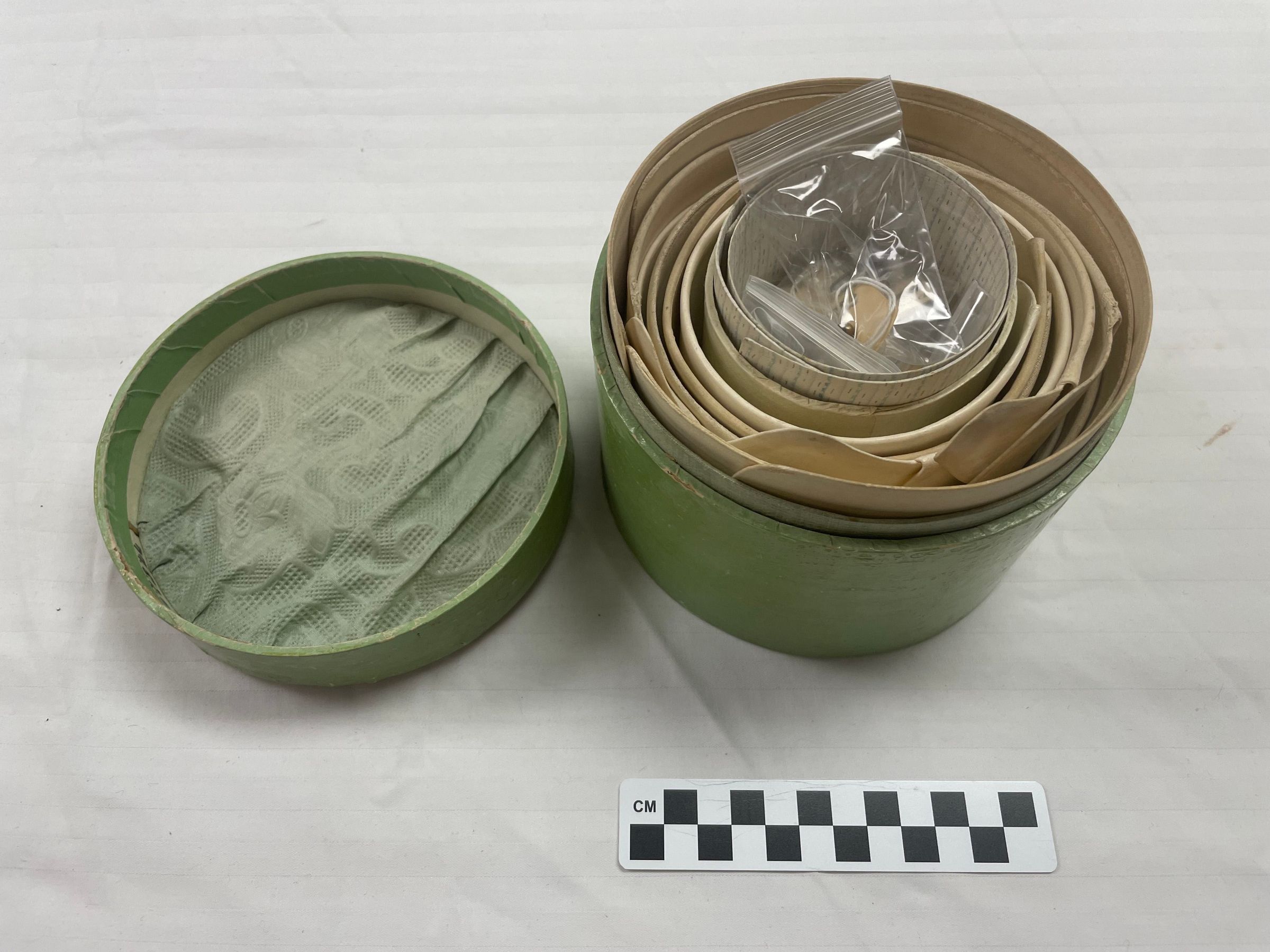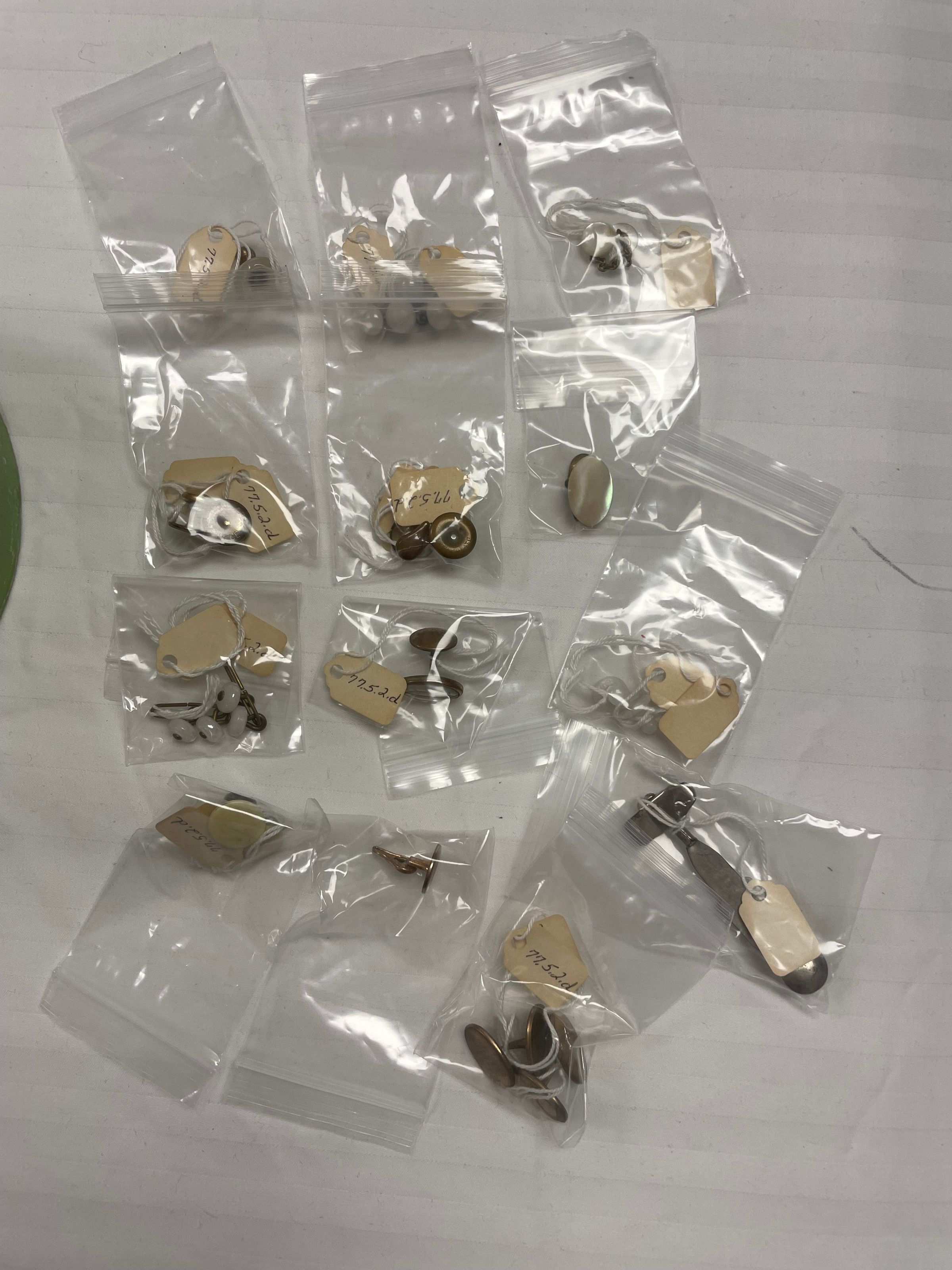 Inside the box contains ~13 stiff, off-white collars and cuffs. They are arranged in a way where the widest is on the outside, getting smaller as it gets closer to the center. In the center, there are 14 small bags containing cuff links/collar buttons with four extras.
