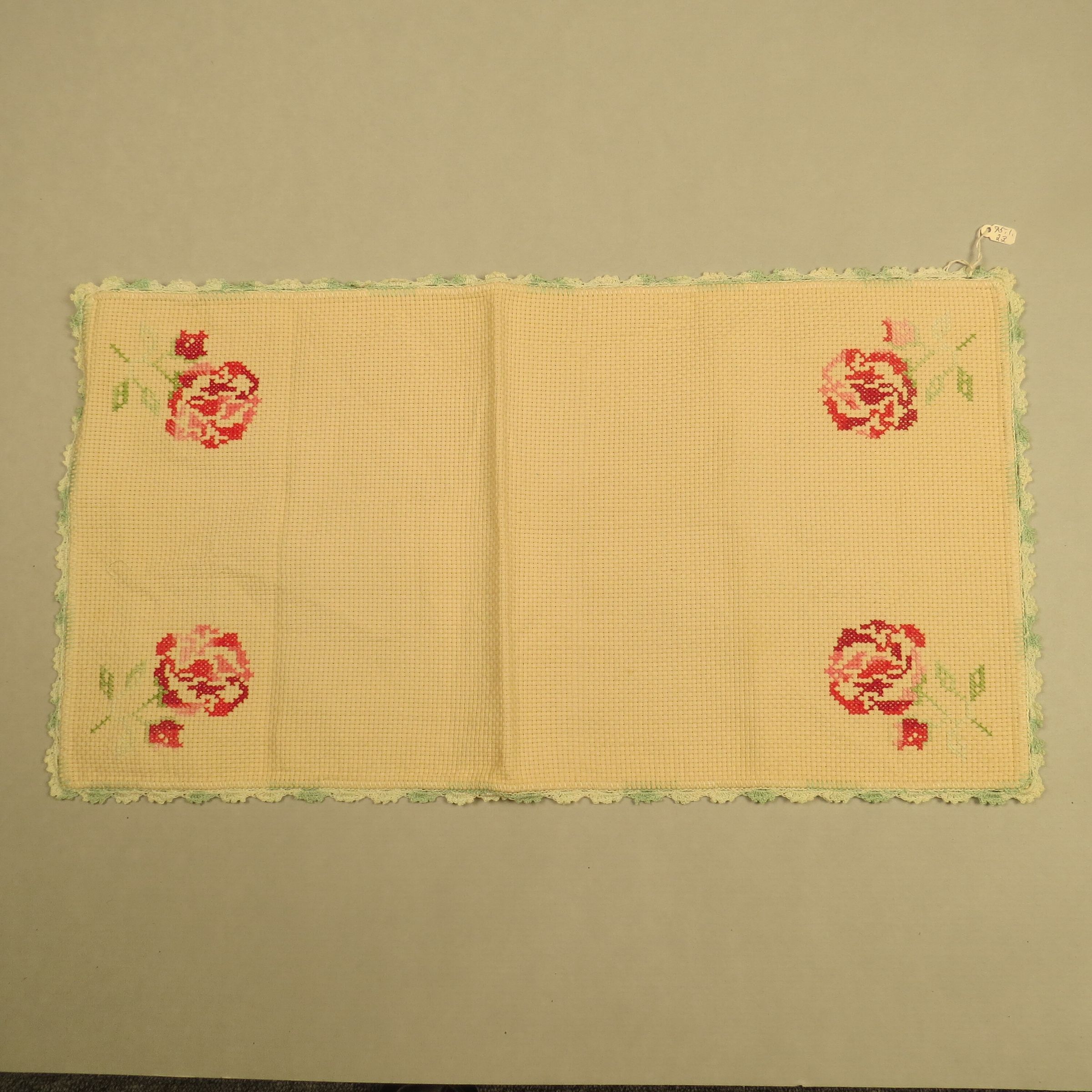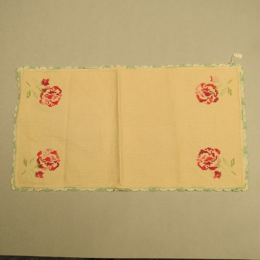 Tan furniture scarf on large scale weave materials with cross-stitch red flowers in the corners. There is a green variegated yarn trim around the outside. The furniture scarf measures 23" (w) x 12" (l).