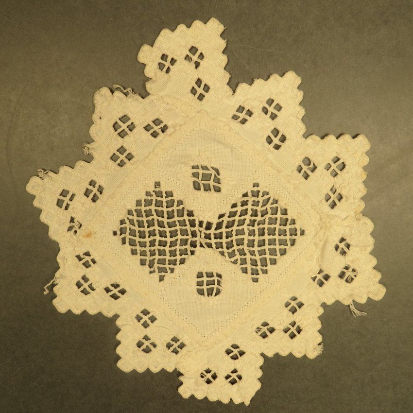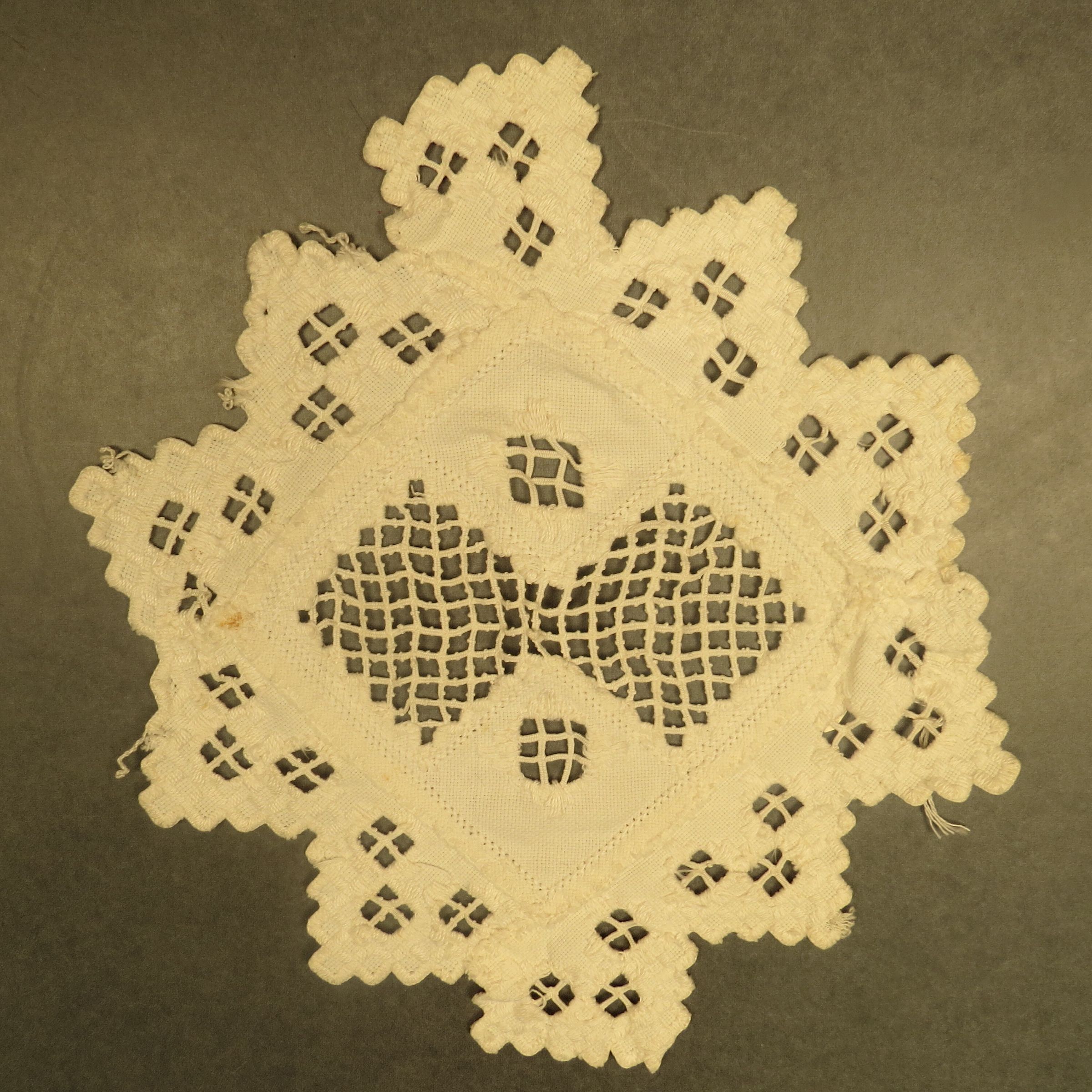 Doily with step-like outside border in a diamond-like design. There is openwork with grids throughout. The doily measures 10" (w) x 10" (l).