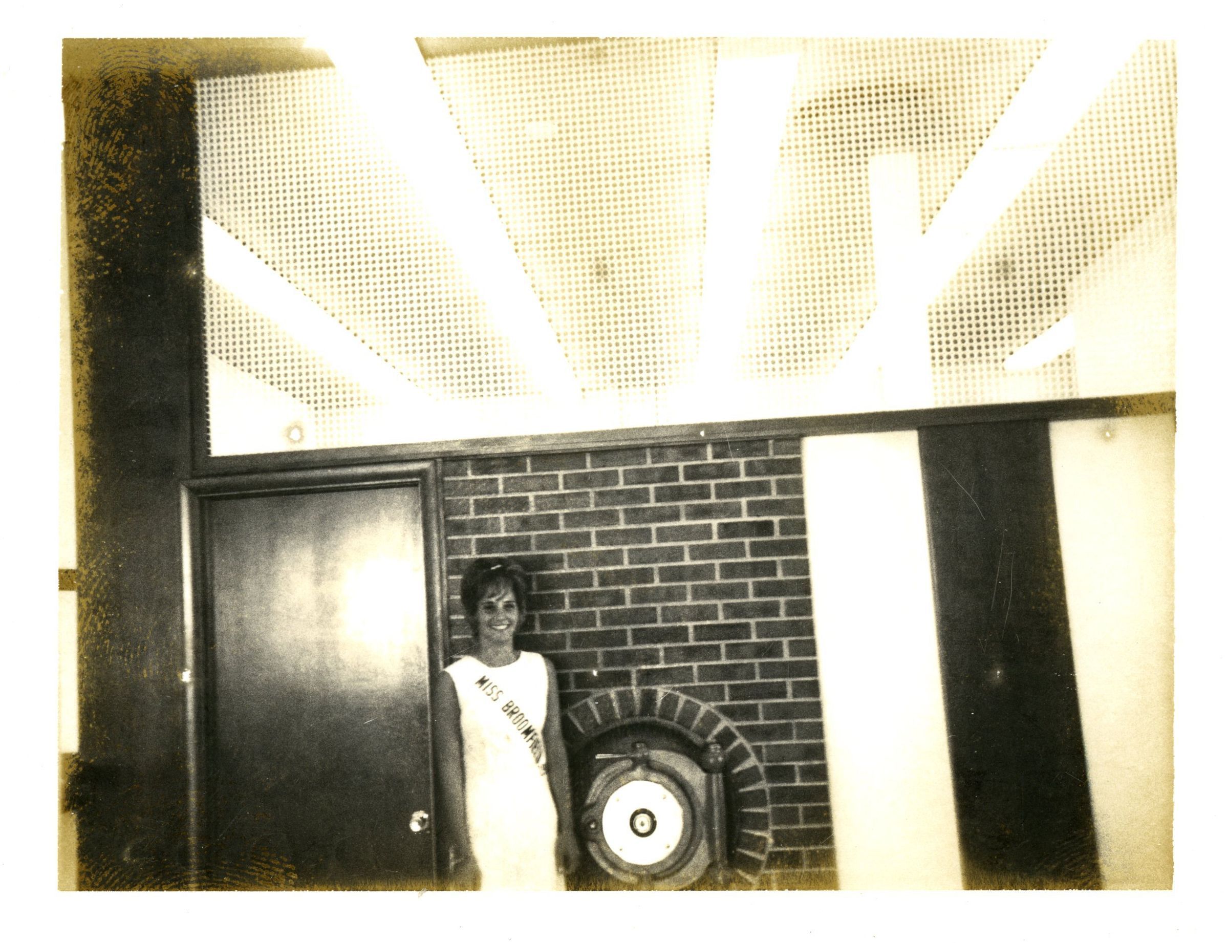 Black and white photo of woman standing in bank lobby with sash reading "Miss Broomfield". Broomfield Bank