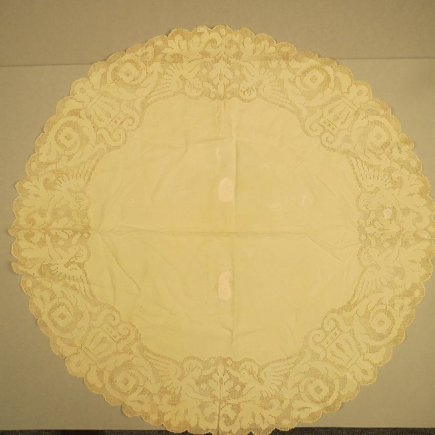 Large off-white table topper with a solid center and then an intricate design of angels and floral arrangements around the last 3 inches. The table topper measures 36" (dia). Listed a doily on registration sheet.