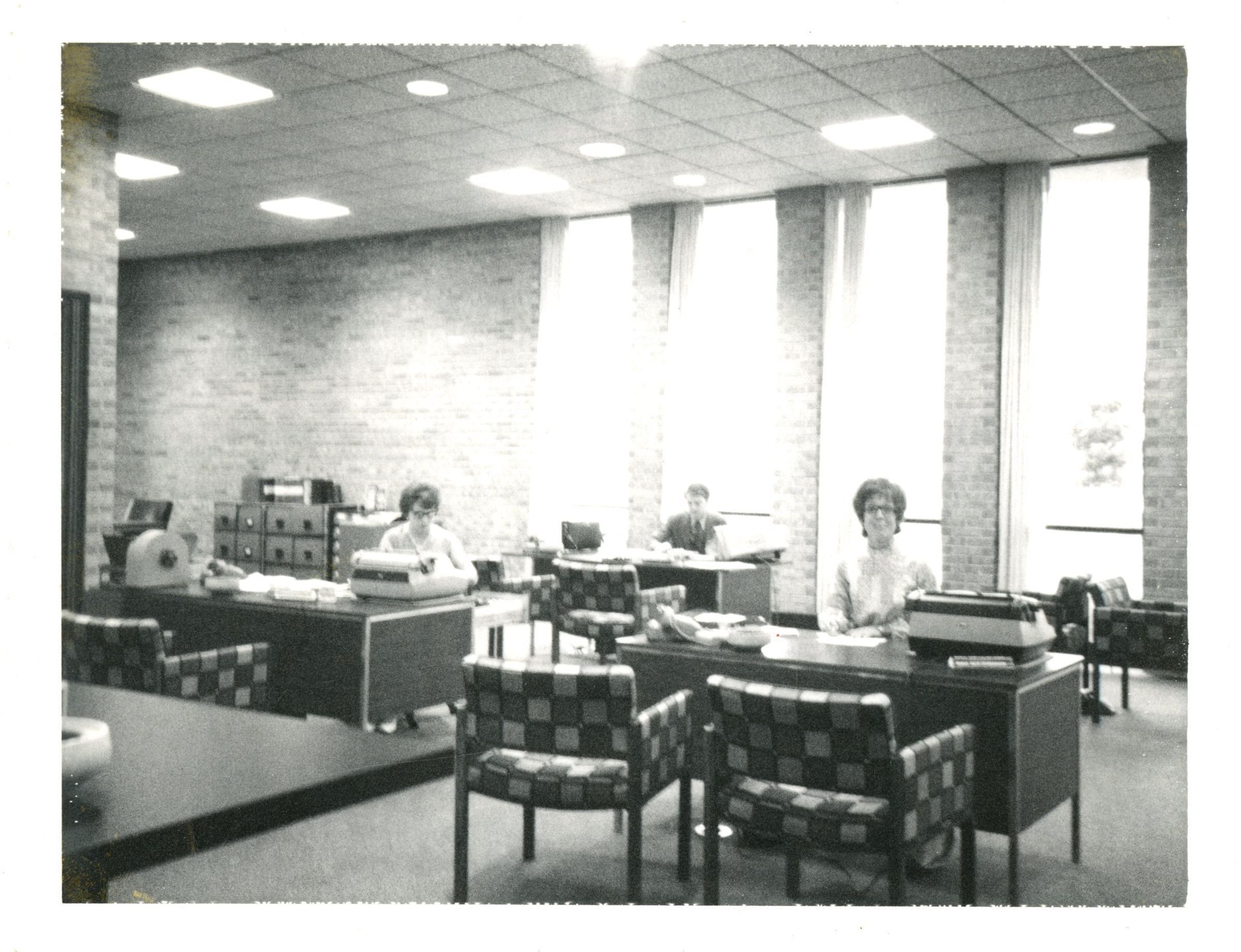 Black and white photo of bank lobby with woman and man sitting at desks. Broomfield Bank