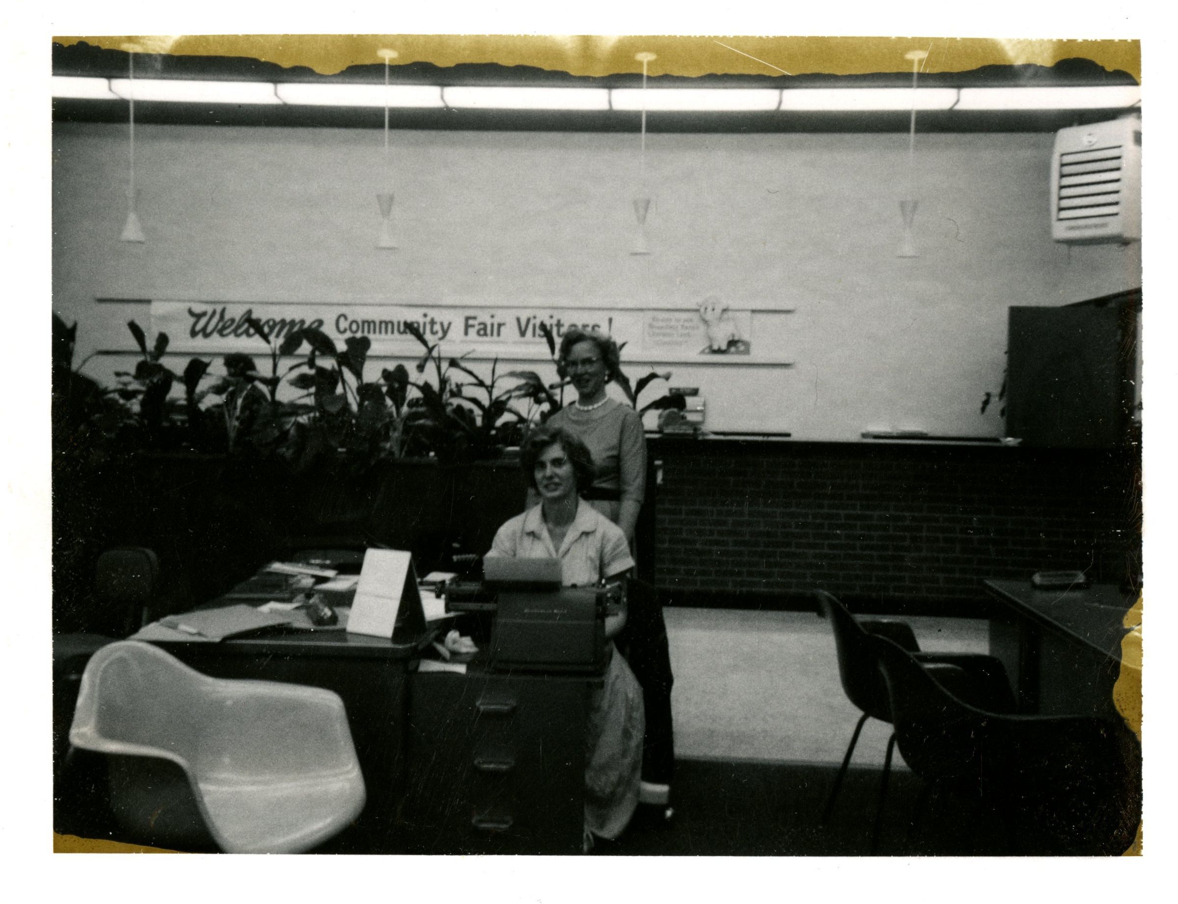 Black and white photo of two woman in bank lobby. Sign behind them reads "Welcome Community Fair Visitors". Broomfield Bank. Lady standing is possibly Betty Taylor.