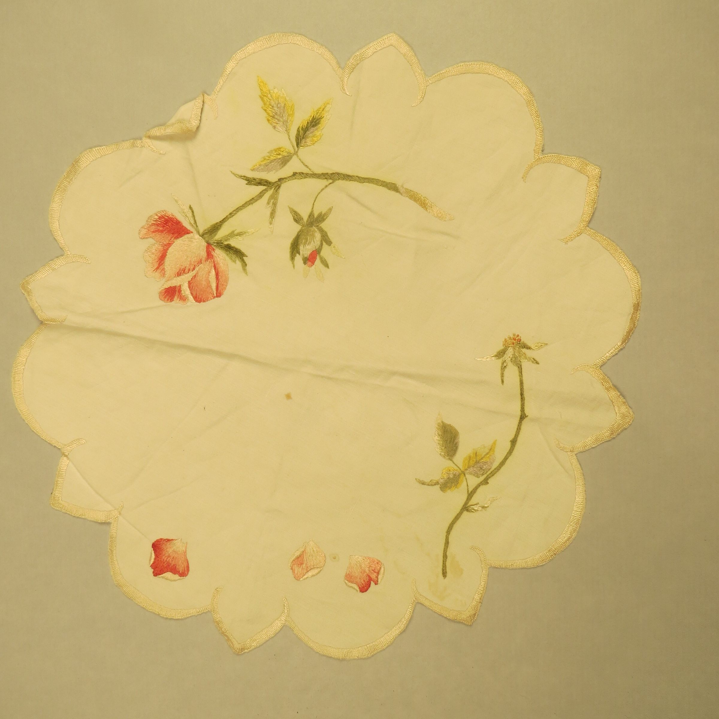 White solid circular furniture scarf of medium size with a red and pink floral on one side and small red embellishments on top and then a green stem and leaves with white daisy on the other side. The edge is irregularly scalloped with machine finished edge. The embroidered threads may be a silk or synthetic material. The furniture scarf measures 16" (dia).
