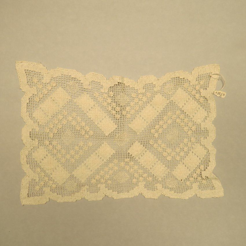 Part of a set of three matching rectangular lace scarves for furniture. More of a geometric lace design than floral. Furniture scarf measures 9" (w) x 14" (l).