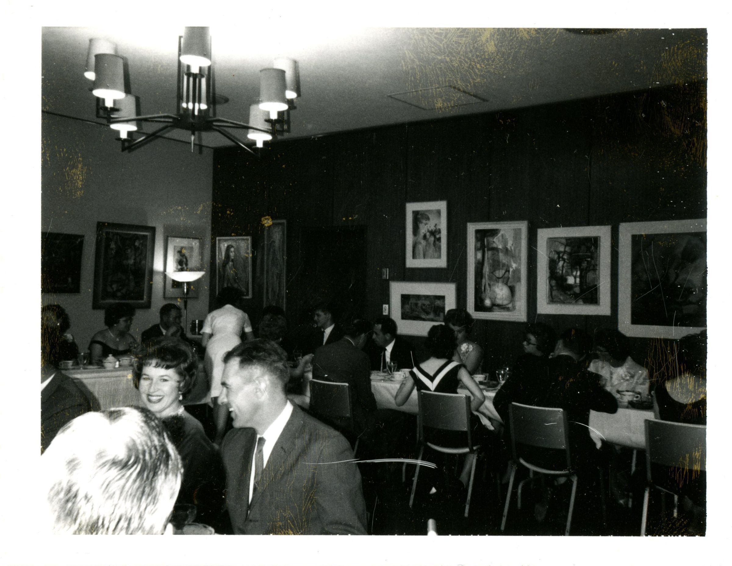Black and white photo of people sitting at banquet tables. Art show? Broomfield Country Club? Broomfield Bank
