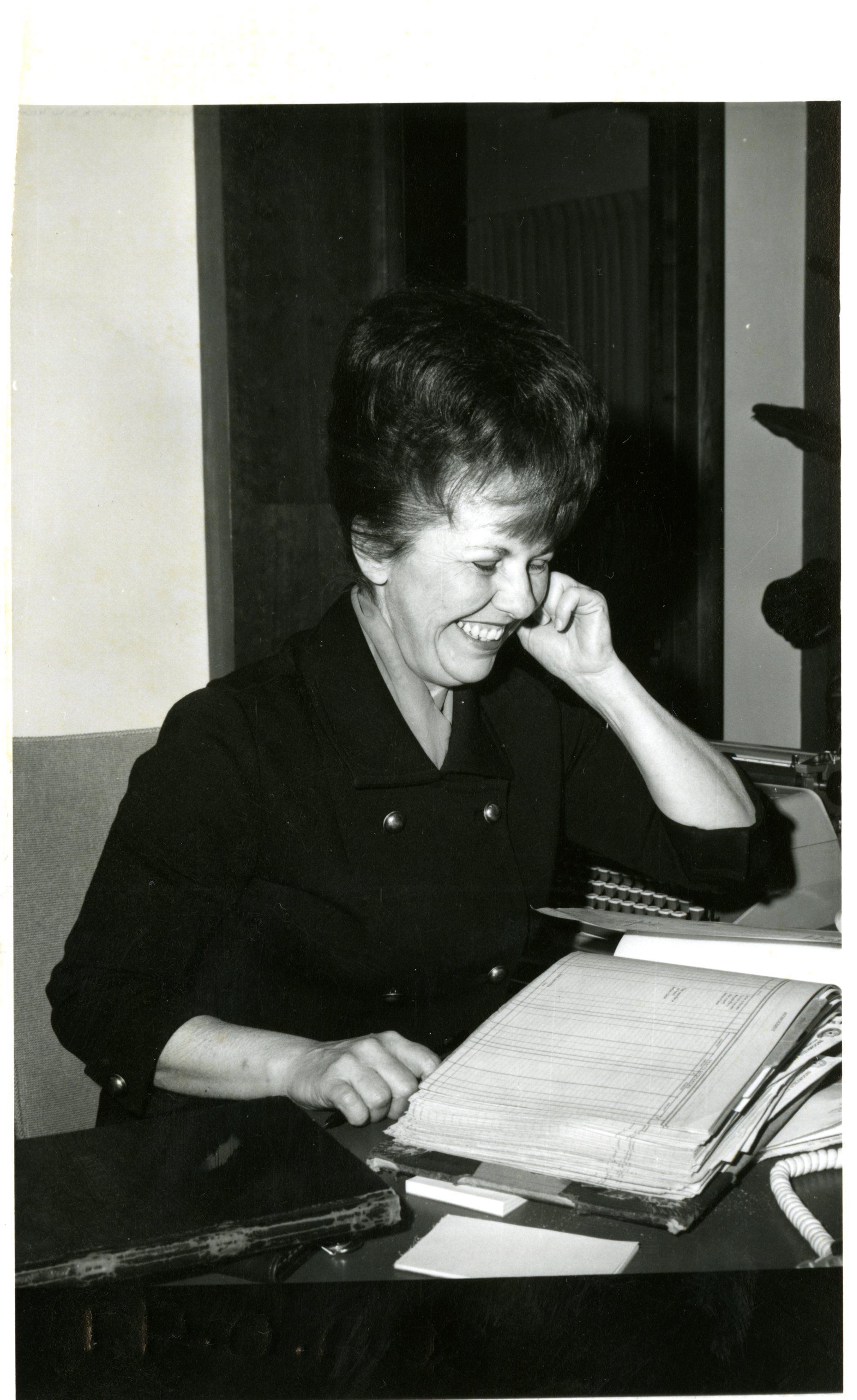 Female bank employee seated at a desk looking at a ledger.